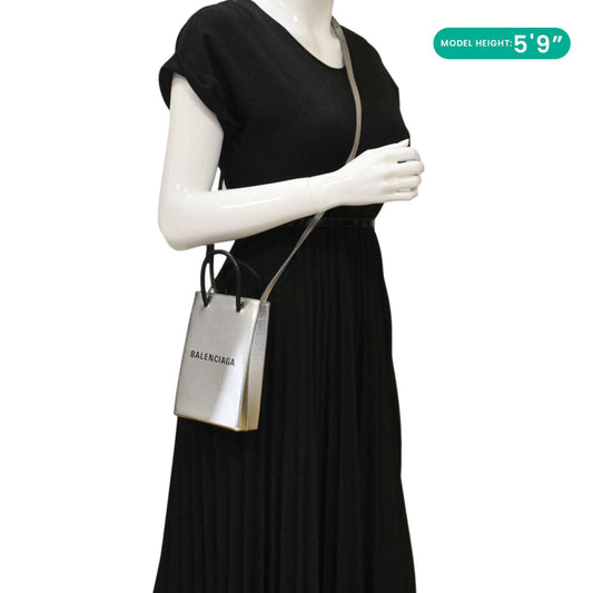 BALENCIAGA Metallic Logo Leather Shopping Phone Holder Silver