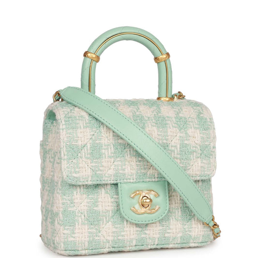 Chanel Mini Square Flap with Top Handle Turquoise and Ecru Tweed Antique Gold Hardware