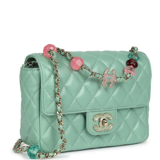 Chanel Mini Square Pearl Crush Flap Bag Green Lambskin Antique Gold Hardware