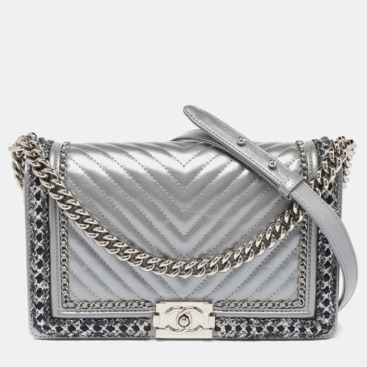 Chanel Silver Quilted Leather New Medium Boy Flap Bag