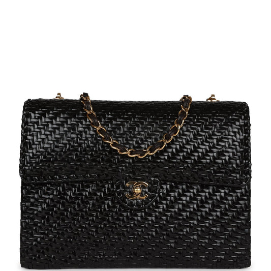 Vintage Chanel Flap Bag Black Wicker Gold Hardware