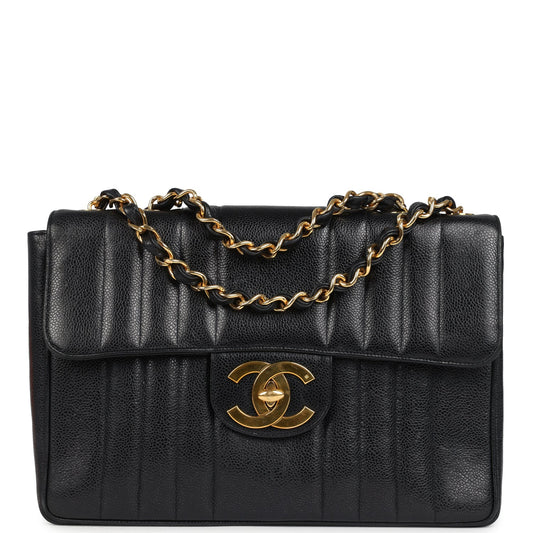 Vintage Chanel Jumbo Classic Mademoiselle Vertical Flap Black Caviar Gold Hardware