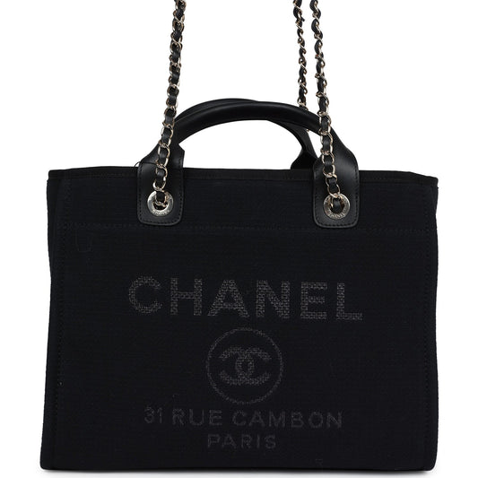Chanel Small Deauville Shopping Tote Black Canvas Light Gold Hardware