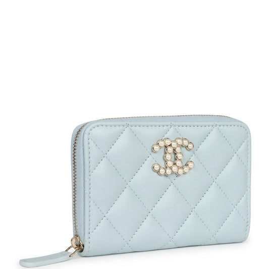 Chanel Small Pearl Classic Zipped Coin Purse Wallet Light Blue Lambskin Light Gold Hardware
