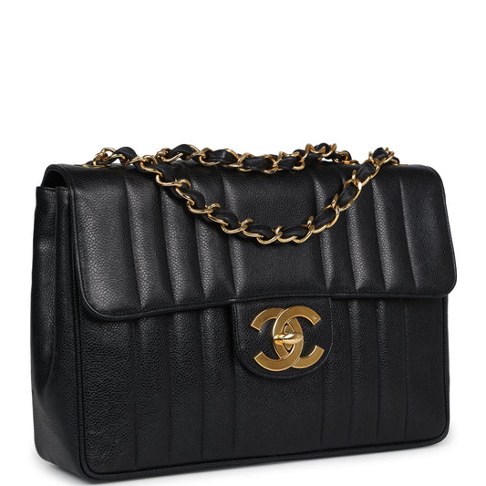 Vintage Chanel XL Jumbo Classic Mademoiselle Vertical Flap Black Caviar Gold Hardware