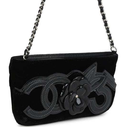 Vintage Chanel No. 5 Camelia Pochette Black Velvet Silver Hardware