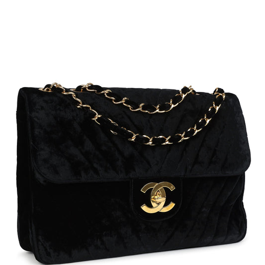 Vintage Chanel XL Classic Chevron Single Flap Bag Black Velvet Gold Hardware