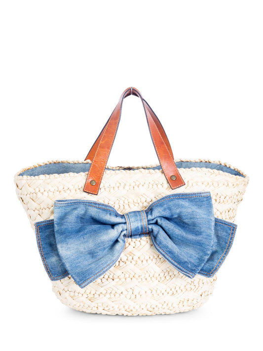 Red Valentino Straw Raffia Denim Bow Bag Beige