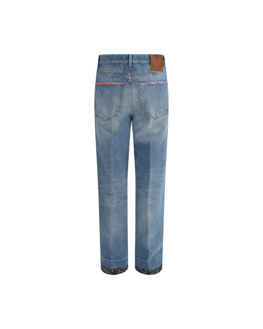Valentino Straight Leg Jeans Floral Trim Women Blue Pants