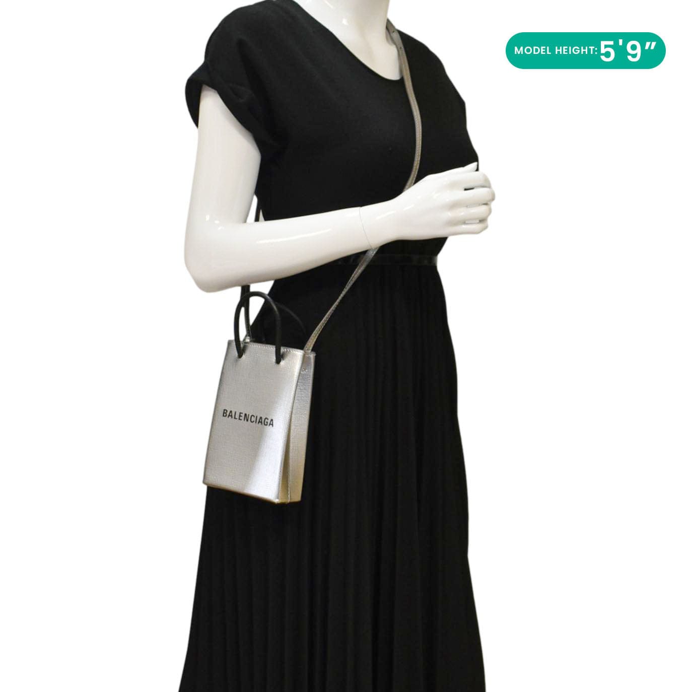 The BALENCIAGA Metallic Logo Leather Shopping Phone Holder in silver features sleek metallic leather with the bold Balenciaga logo printed on the front. Compact and modern, it’s perfect for carrying your phone and small essentials in style.