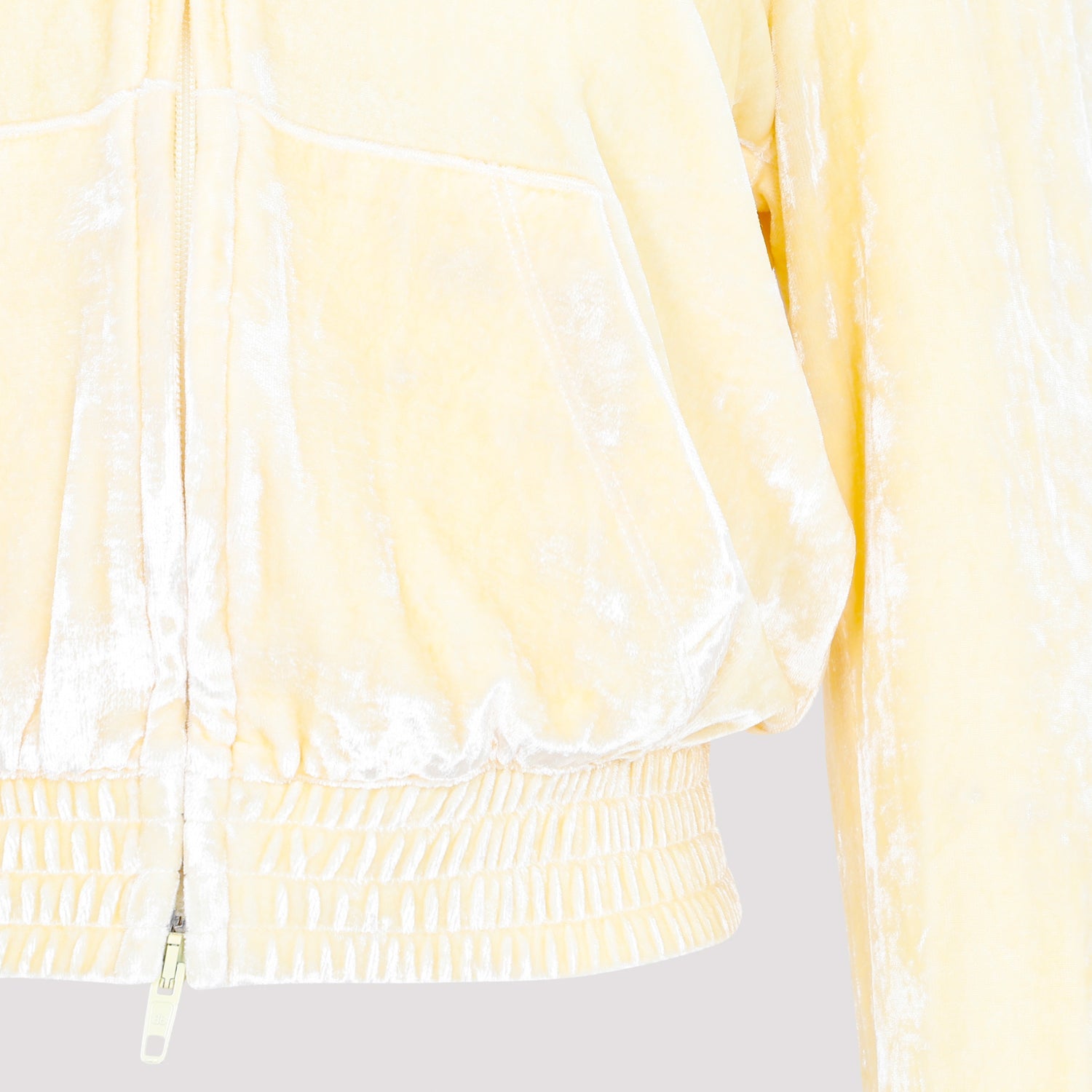 Balenciaga Fitted Zip-Up Cream Viscose Hoodie. Cream chenille viscose blend, hooded, double tonal zip closure, kangaroo pocket, rhinestones logo on the back, cuffs and hem shirred. Viscose | 77%VISCOSE 21%POLYAMIDE 2%ELASTANE