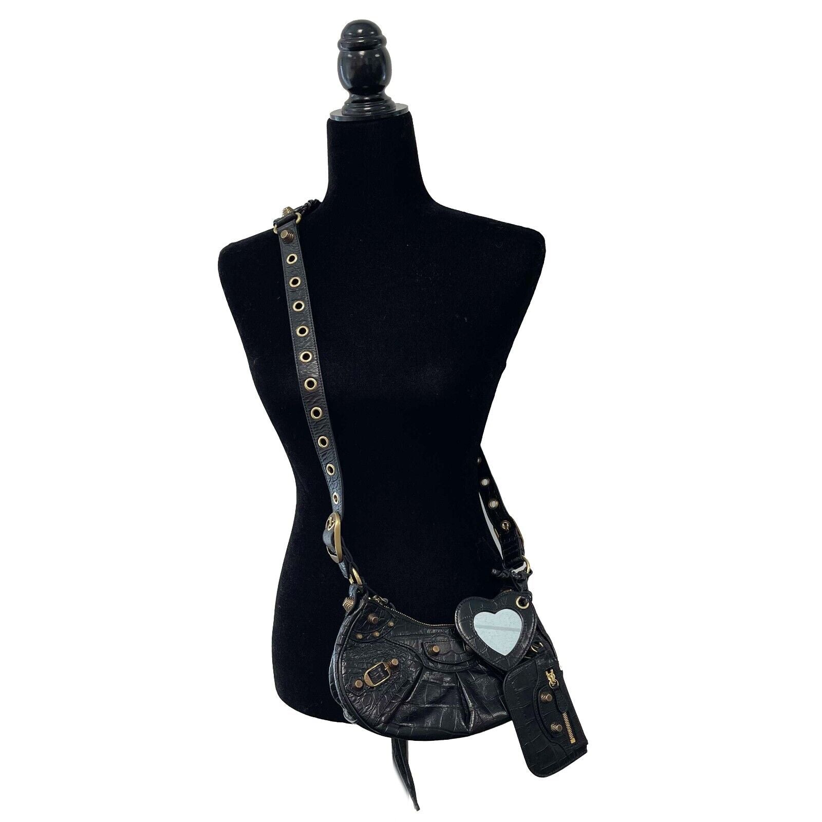 BALENCIAGA - XS Shoulder Bag Crocodile Embossed Black Studded Shoulder Bag NEW