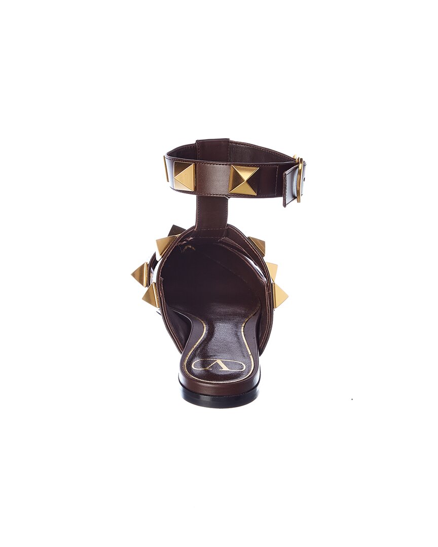- Roman Stud Leather Ankle Strap Flat In Brown Leather With Gold-Tone Hardware And Roman Studs