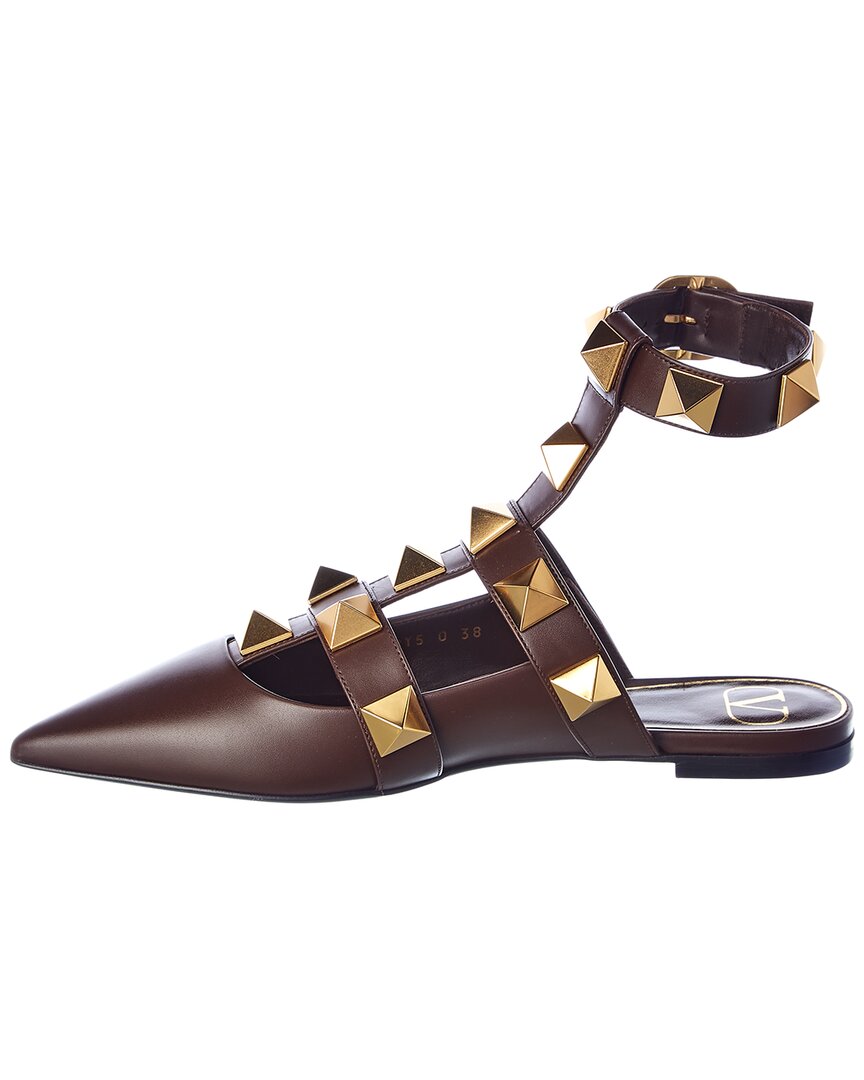 - Roman Stud Leather Ankle Strap Flat In Brown Leather With Gold-Tone Hardware And Roman Studs