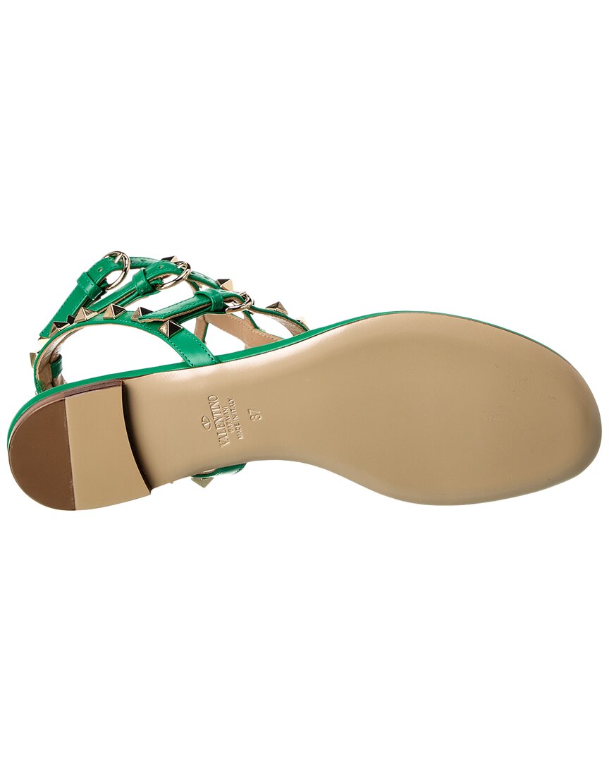 - Rockstud Caged Leather Ankle Strap Sandal In Green Leather With Platinum-Finish Rockstuds