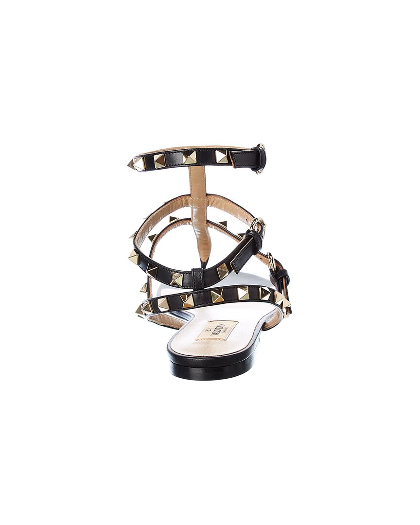 - Rockstud Leather Sandal In Black Leather And Gold-Tone Hardware With T-Strap Design And Platinum-Finish Rockstuds