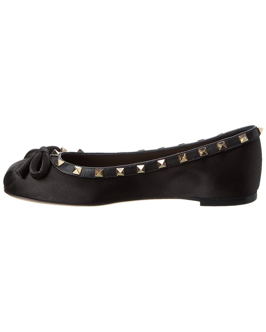 - Rockstud Satin & Leather Ballerina Flat In Black Satin And Leather With Platinum-Finish Rockstuds And Padded Bow
