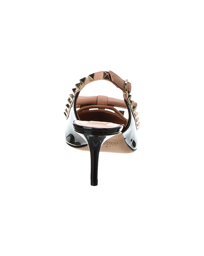 - Rockstud 60 Patent Slingback Pump In Black Patent Leather With Powder Leather Trim, Platinum-Finish Rockstuds And Padded Bow Accent