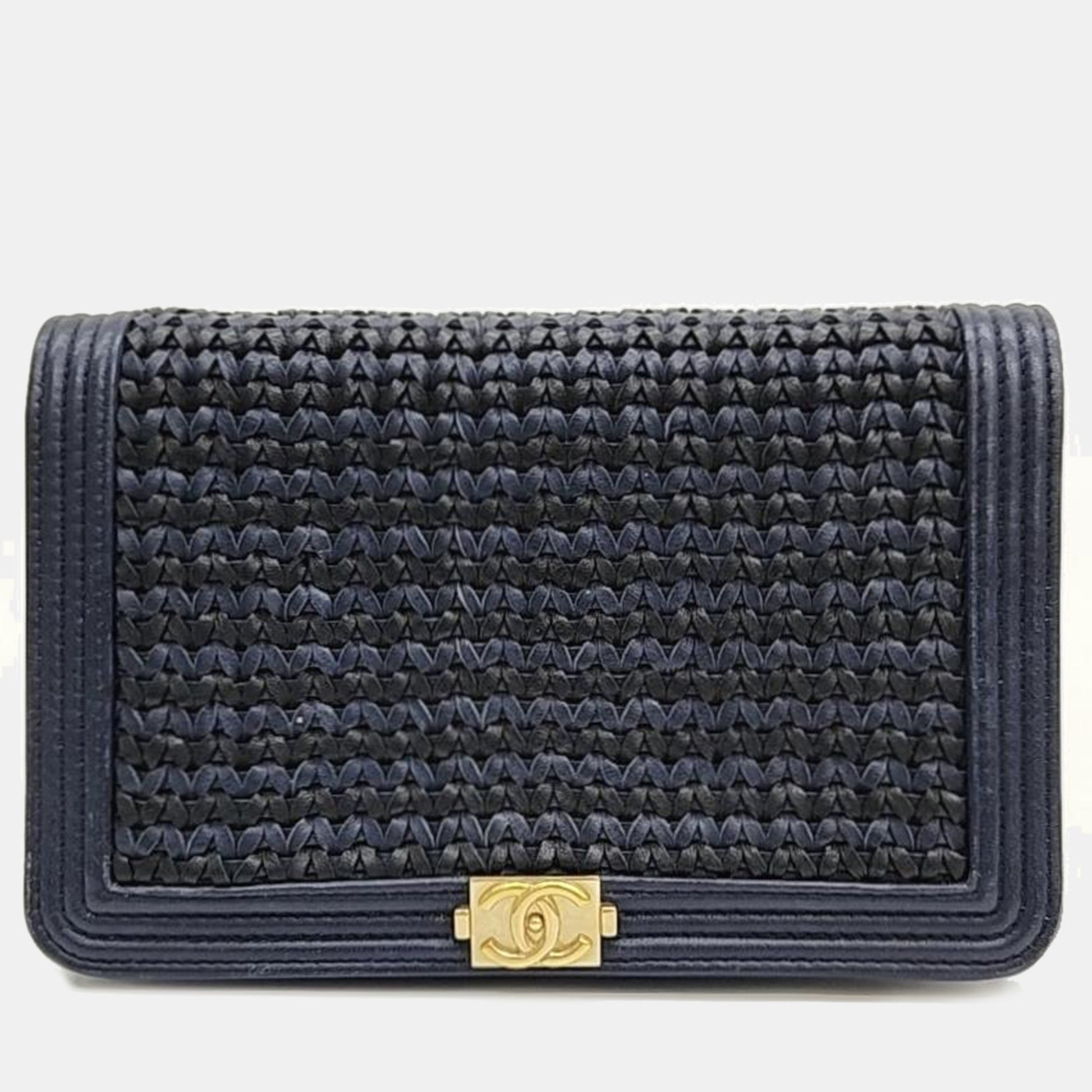 Chanel Blue/Gold Woven Leather New Boy Wallet On Chain