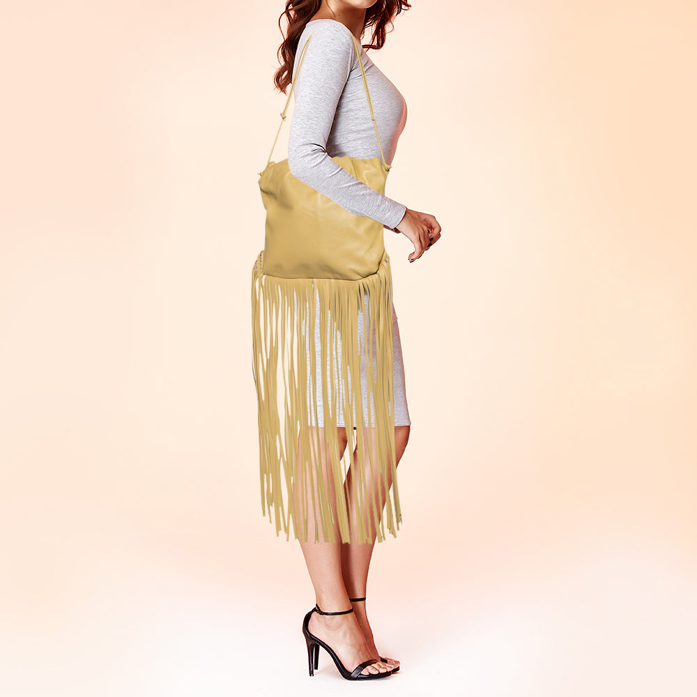 Give yourself a boost of confidence and style with this hobo bag from the house of Bottega Veneta. This bag has been brilliantly designed with beige leather as well as a fringe. It has a single shoulder handle leather lined interior and gold tone hardware.