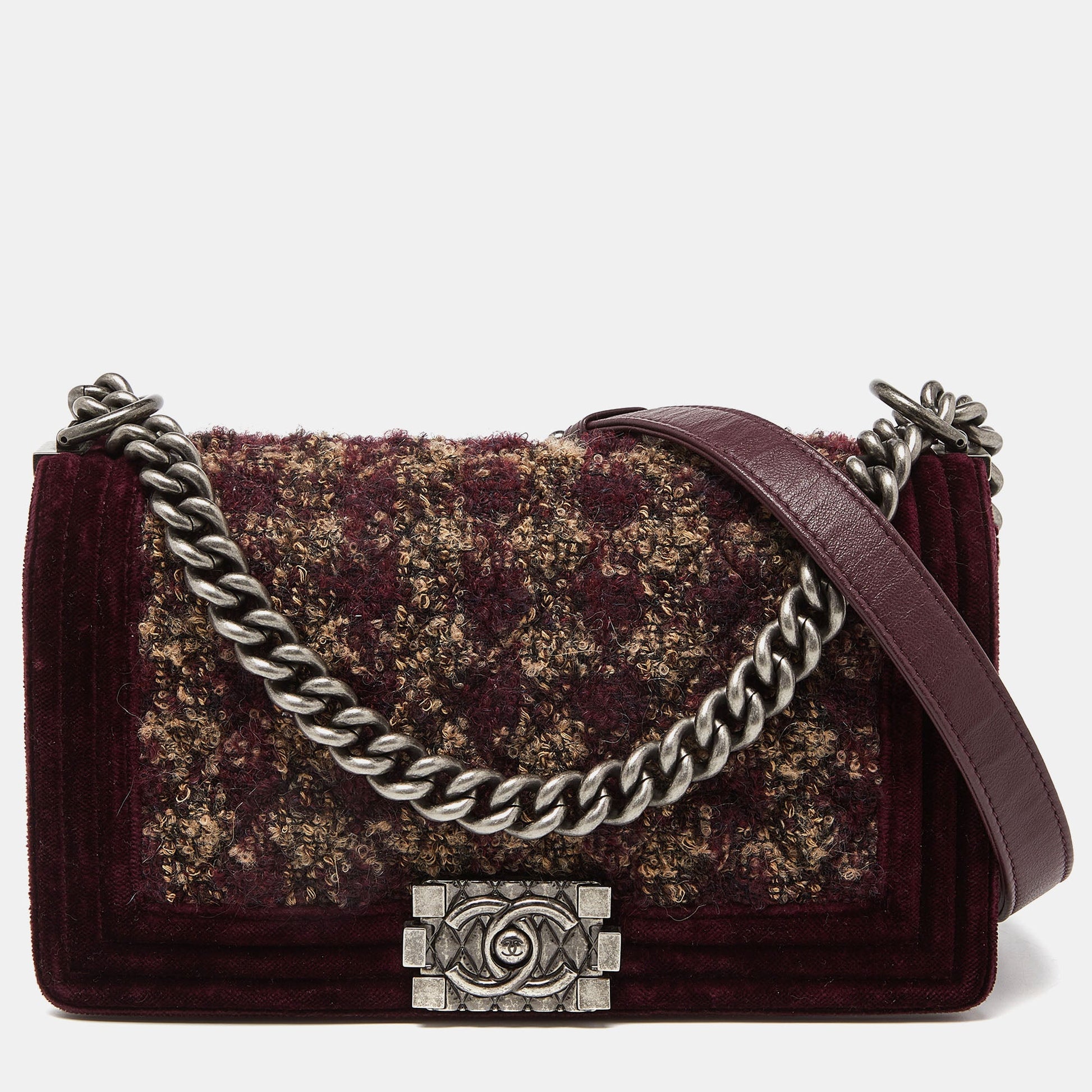 Chanel Burgundy Quilted Tweed,Leather and Velvet Medium Boy Flap Bag