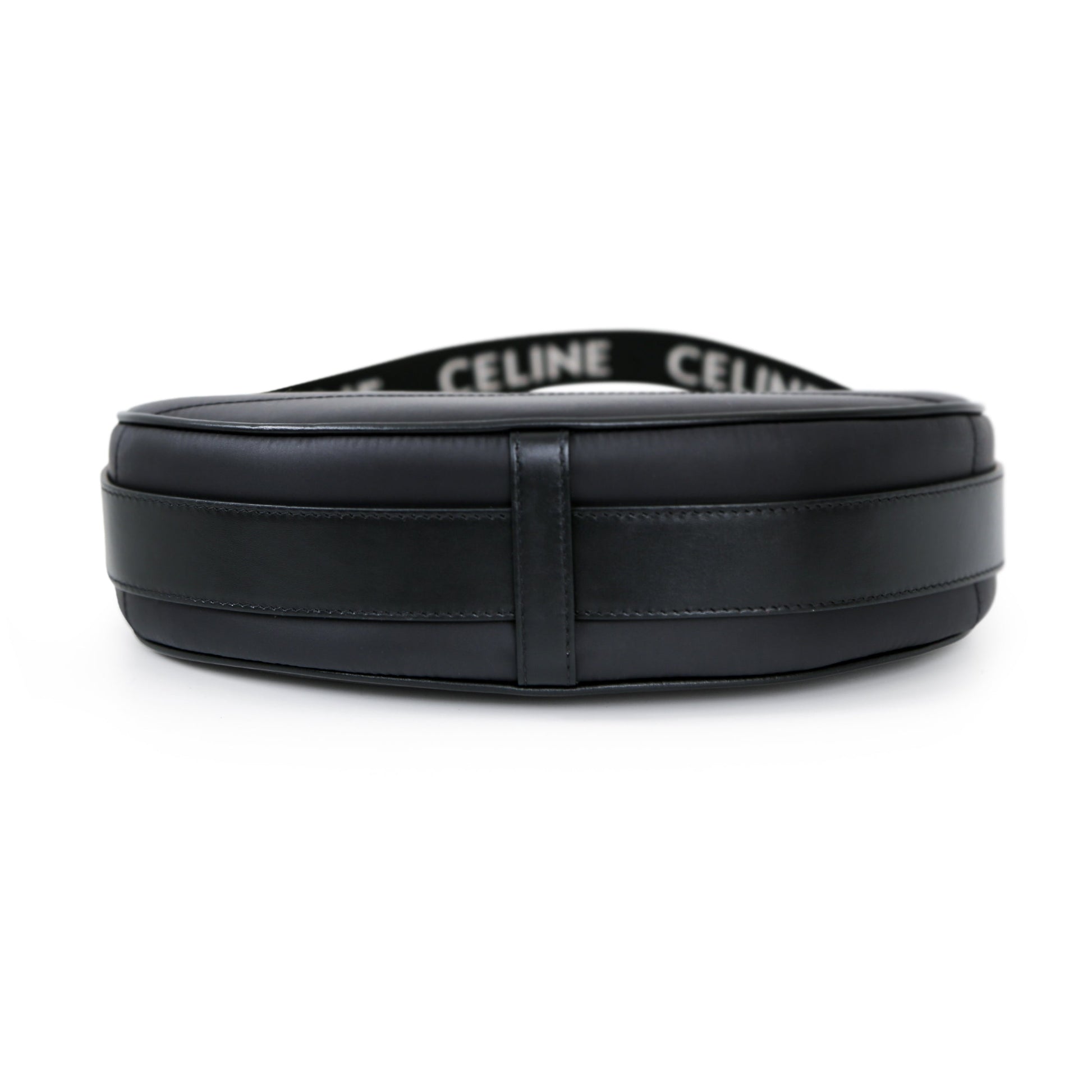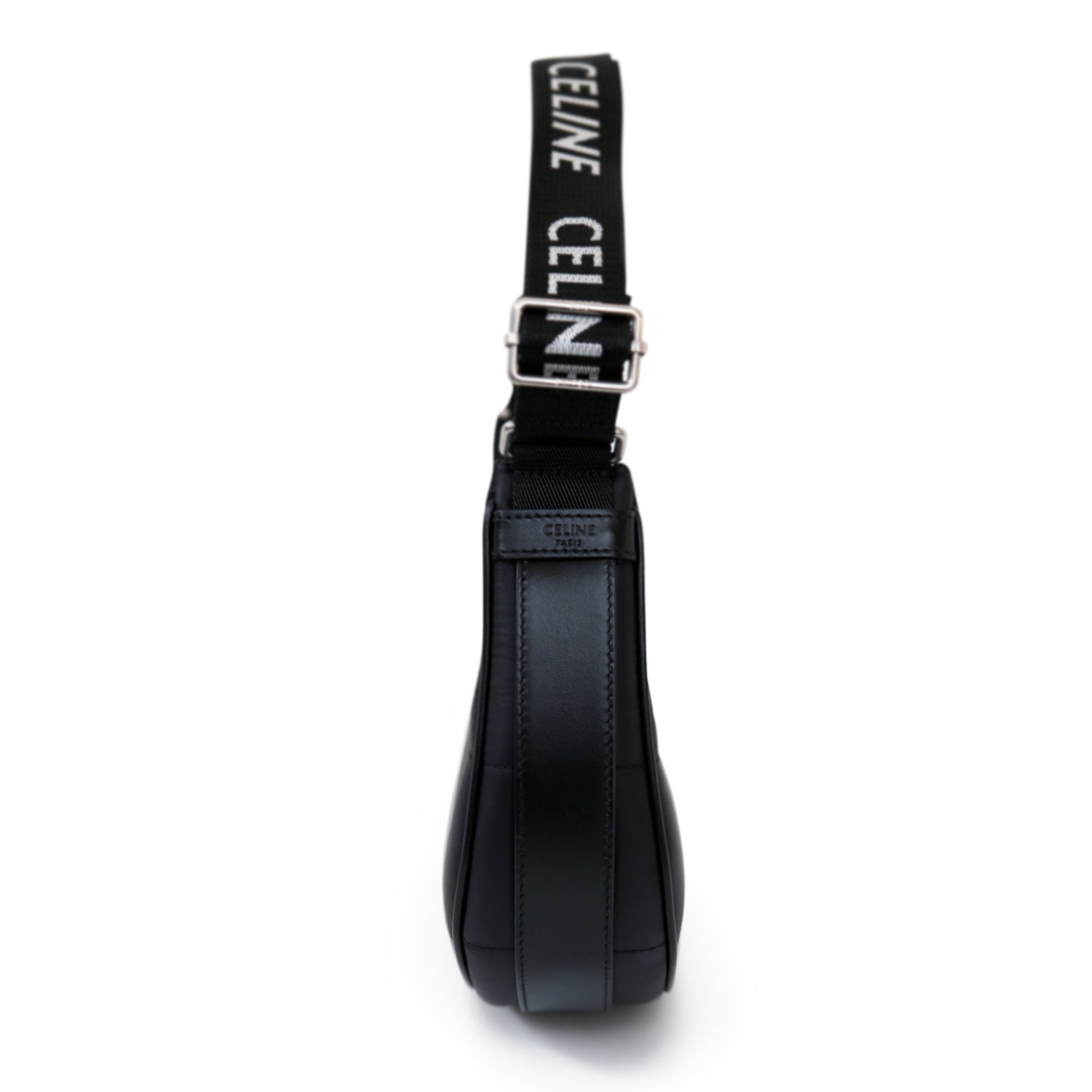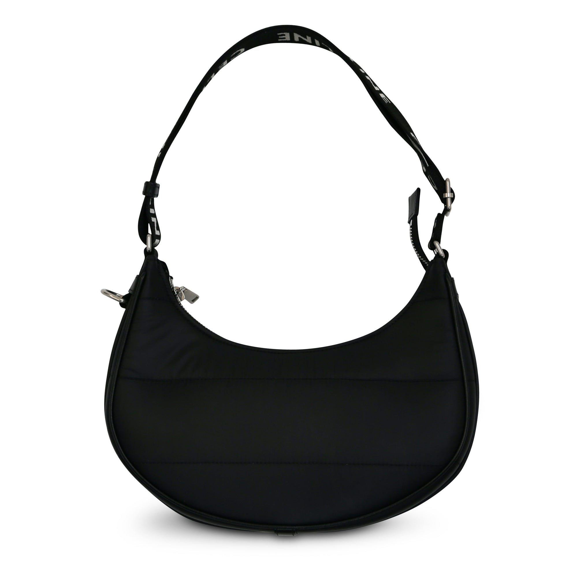 This chic black nylon bag with black leather trim has an adjustable strap and silver hardware.