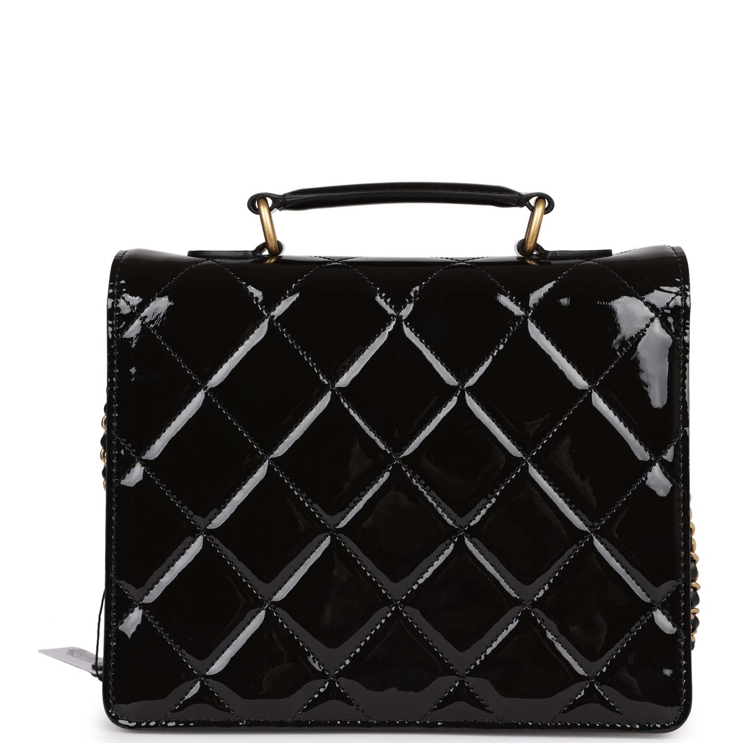 Chanel Accordion Pushlock Top Handle Flap Bag Black Patent Leather Aged Gold Hardware