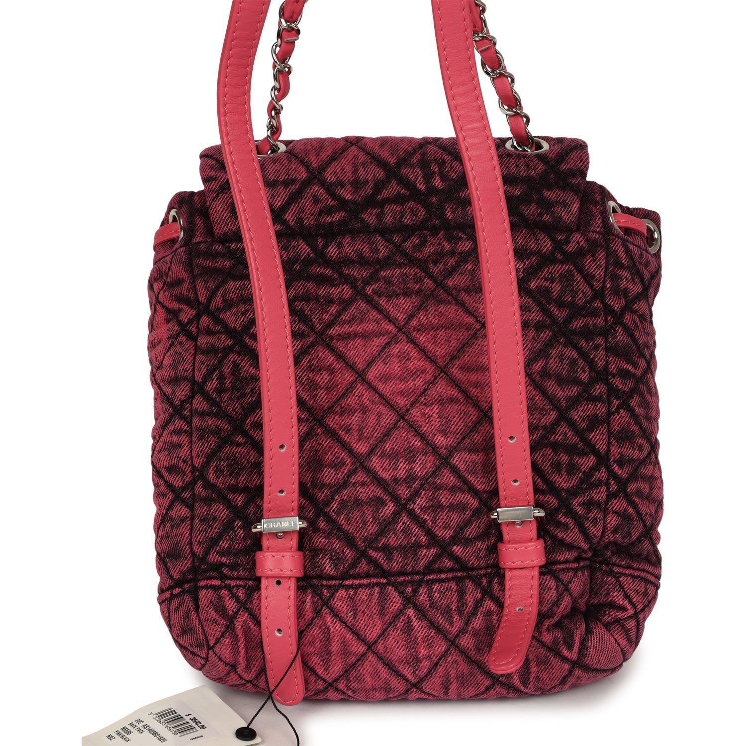 This Denimpression Urban Spirit backpack is of rose pink and black washed denim with silver tone hardware and has a front flap with signature CC logo, CC turnlock & drawstring closure, a single interwoven rose leather and silver tone chain link top handle and adjustable shoulder straps.