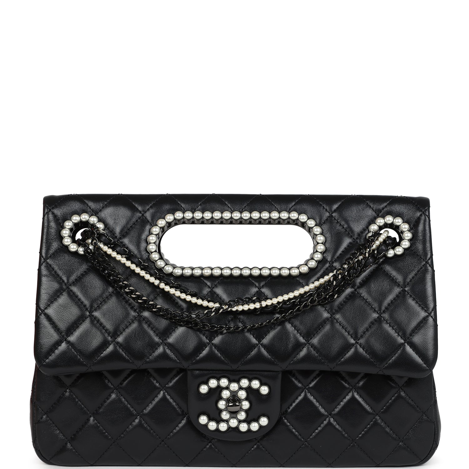 Chanel Large Double Flap Bag with Pearl Cut Out Handle Black Shiny Lambskin Black Hardware