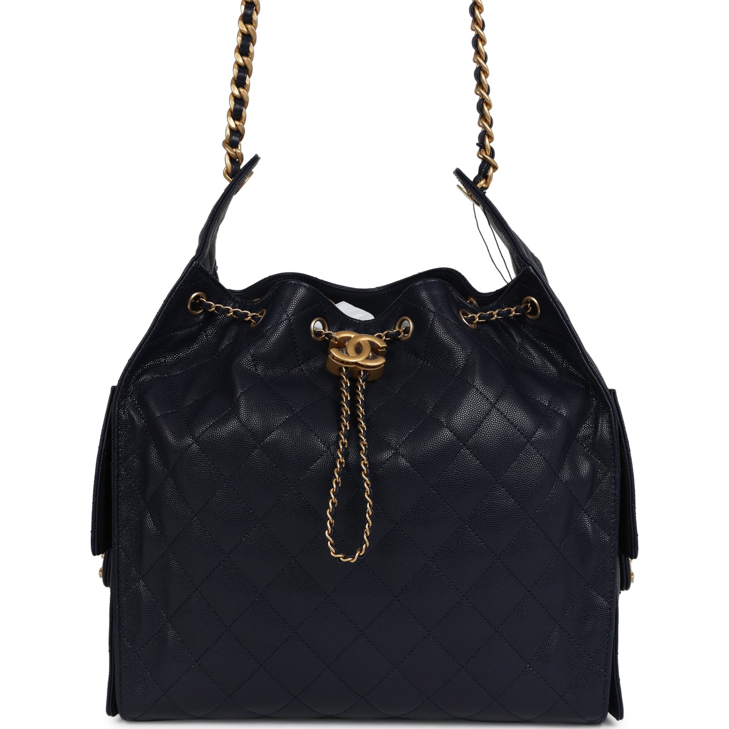 This Chanel Medium 25 Hobo Bag is in dark navy caviar leather with antique gold hardware, features signature diamond quilt, two exterior side pockets, drawstring closure, a removable pouch, and a single interwoven antique gold and dark navy leather shoulder strap.