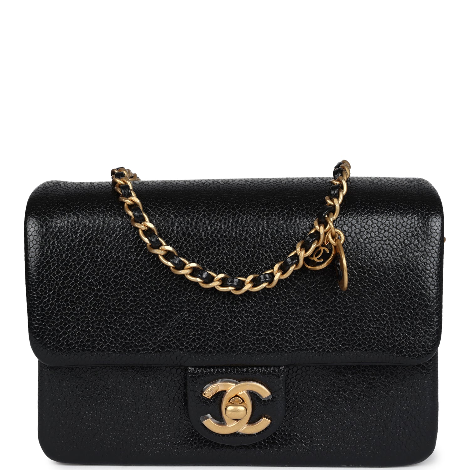 This Chanel Mini Flap Bag is of black grained shiny calfskin leather with brushed Gold Hardware, featuring, a front flap CC turnlock closure and a single interwoven brushed gold and black leather shoulder strap with two round CC coin charms.