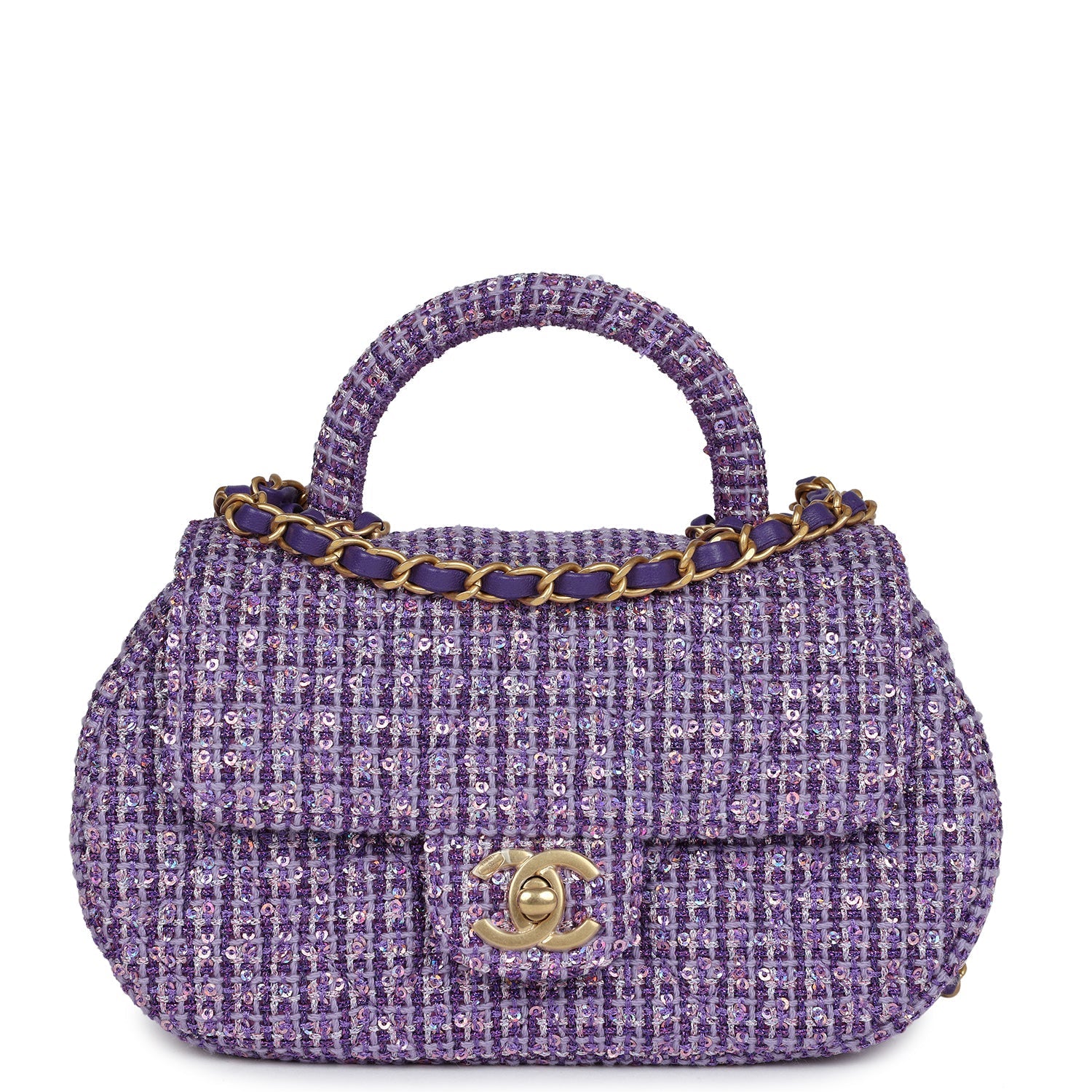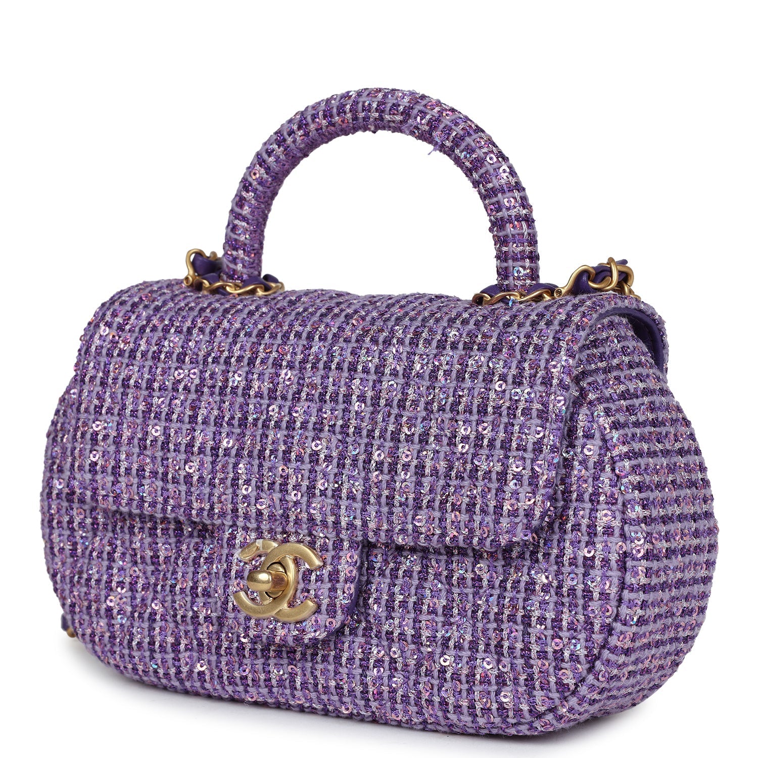Chanel Mini Sequin Flap Bag with Top Handle Purple Tweed Antique Gold Hardware