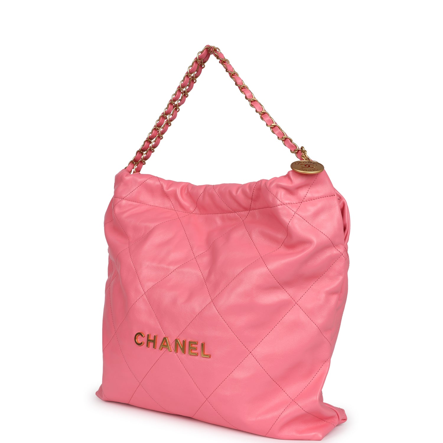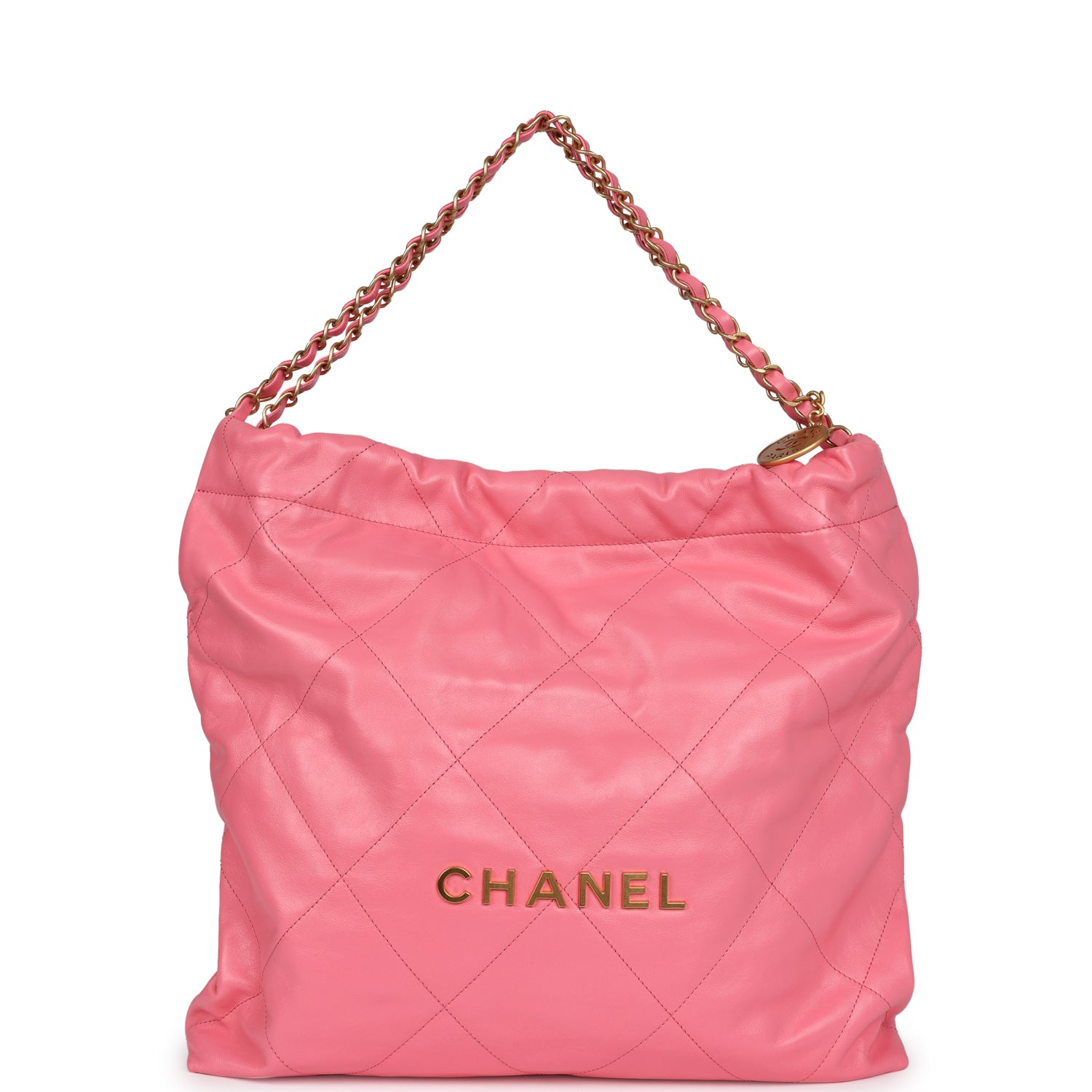 This Small 22 hobo bag is of pink calfskin with gold tone hardware and has the signature diamond quilting, CHANEL on the front in gold metal, removable pouch, and long gold tone and pink leather chain.