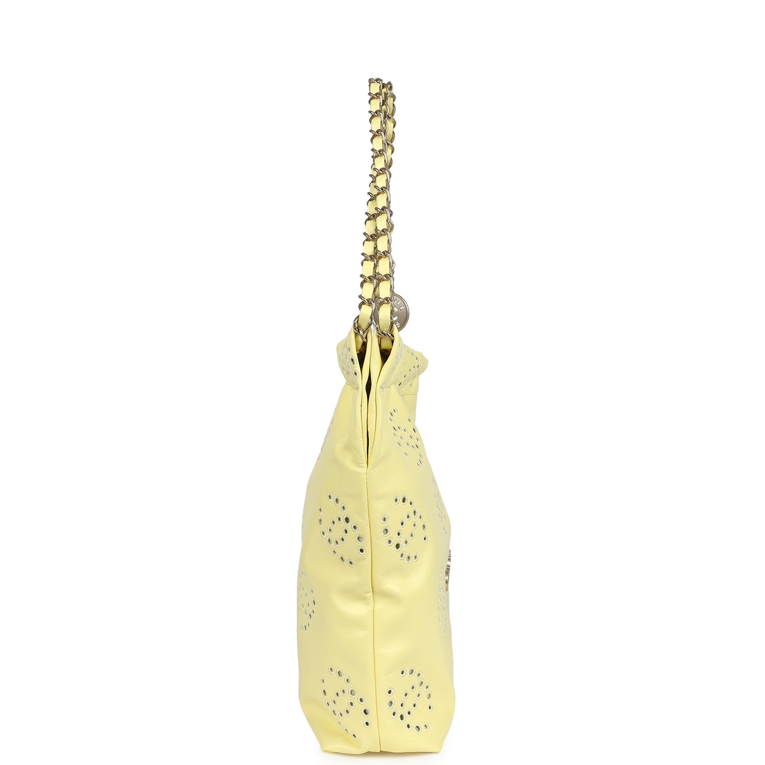 This Chanel Small 22 Hobo Bag is of light yellow shiny calfskin leather with brushed gold tone hardware, has perforated signature CC logos all over, brushed gold tone metal "Chanel" logo on front of bag, Chanel Paris metal hang tag, interwoven chain link with brushed gold metal and yellow leather shoulder straps, and a removable pouch.