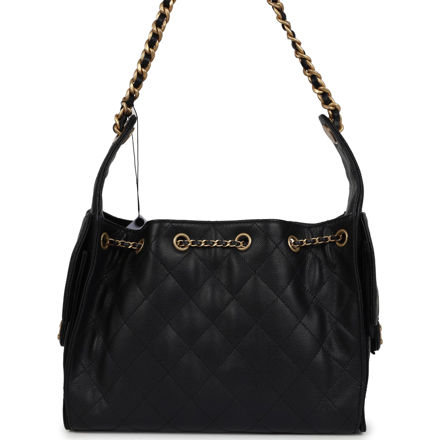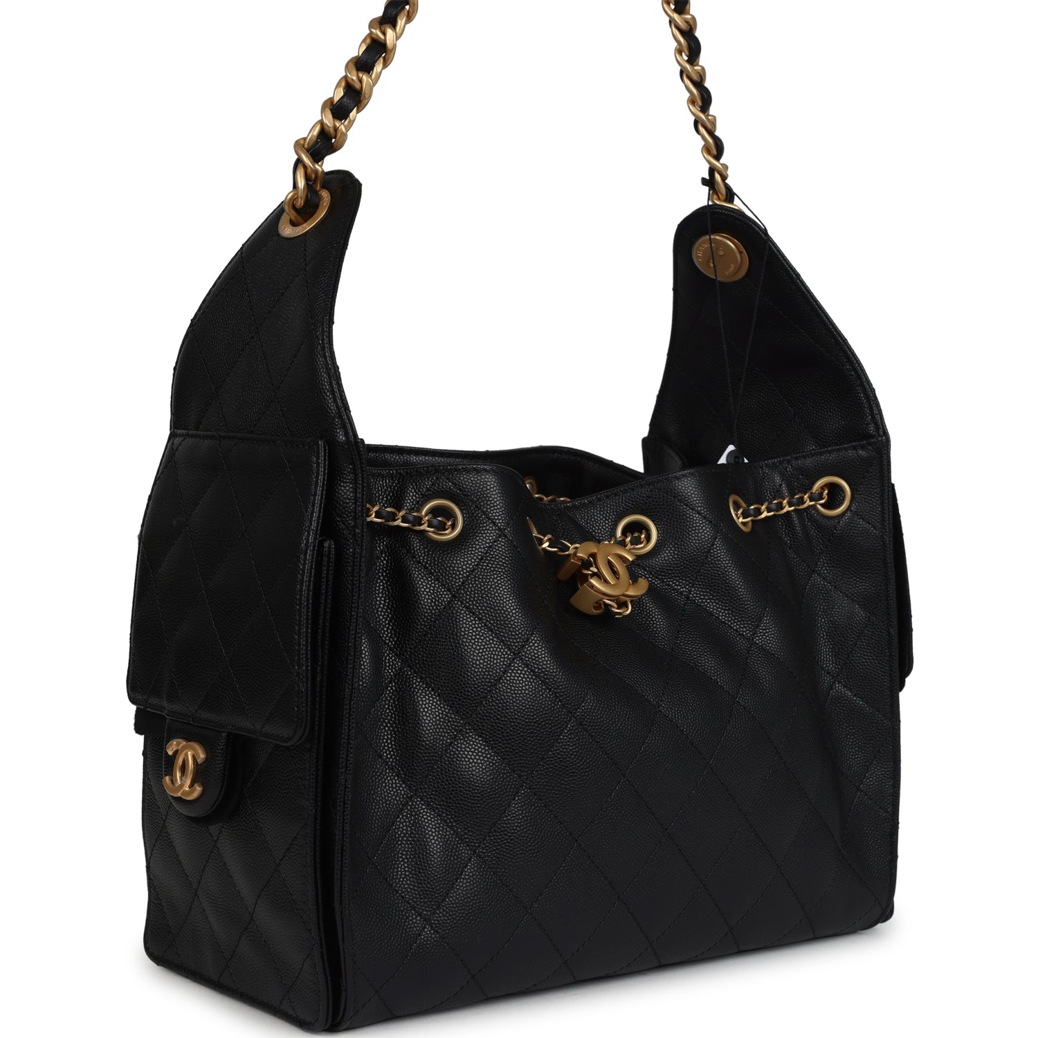 This Chanel Small 25 Hobo Bag is in black caviar leather with antique gold hardware, features signature diamond quilt, two exterior side pockets, drawstring closure, and a single interwoven antique gold and black leather shoulder strap.