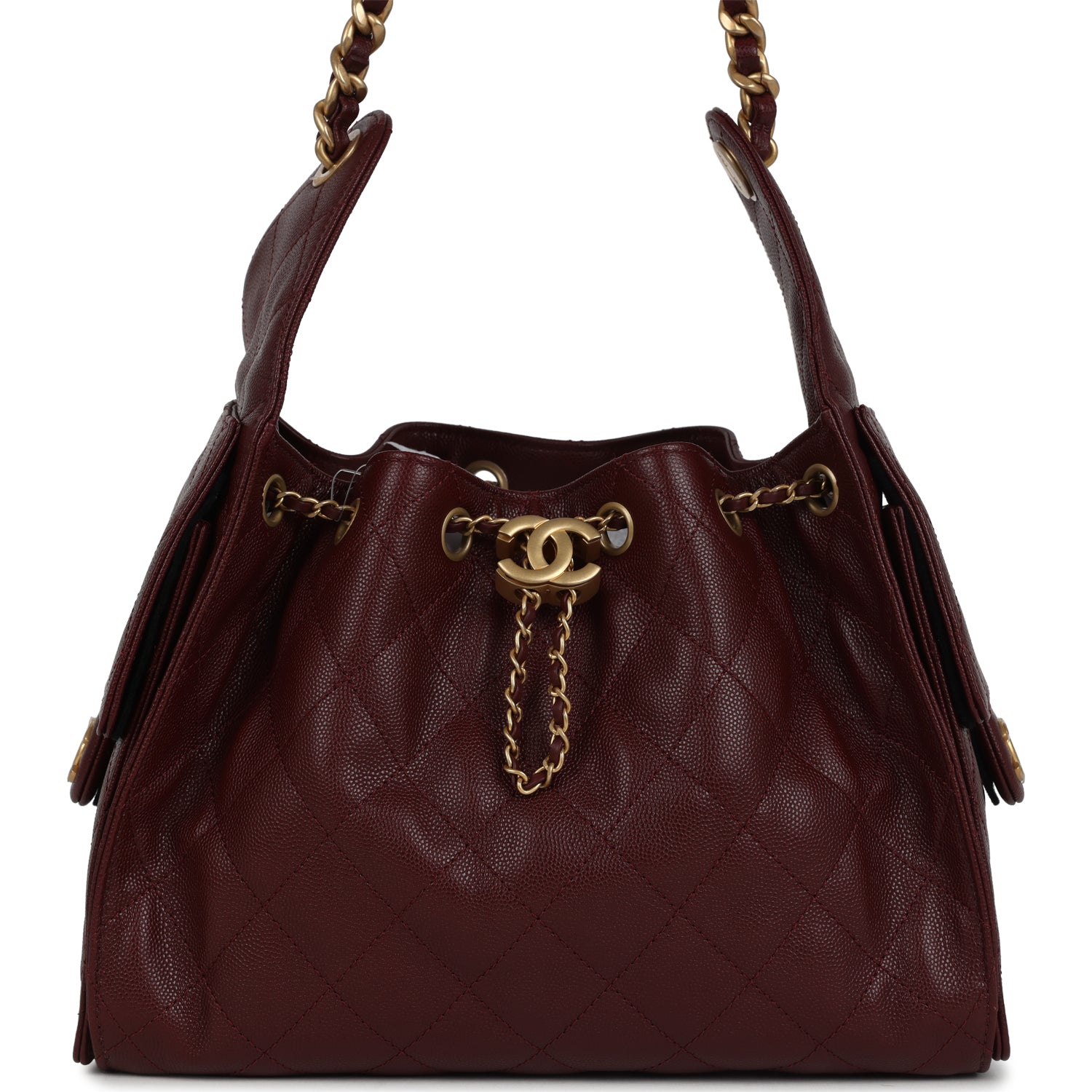 This Chanel Small 25 Hobo Bag is in burgundy caviar leather with antique gold hardware, features signature diamond quilt, two exterior side pockets, drawstring closure, and a single interwoven antique gold and burgundy leather shoulder strap.