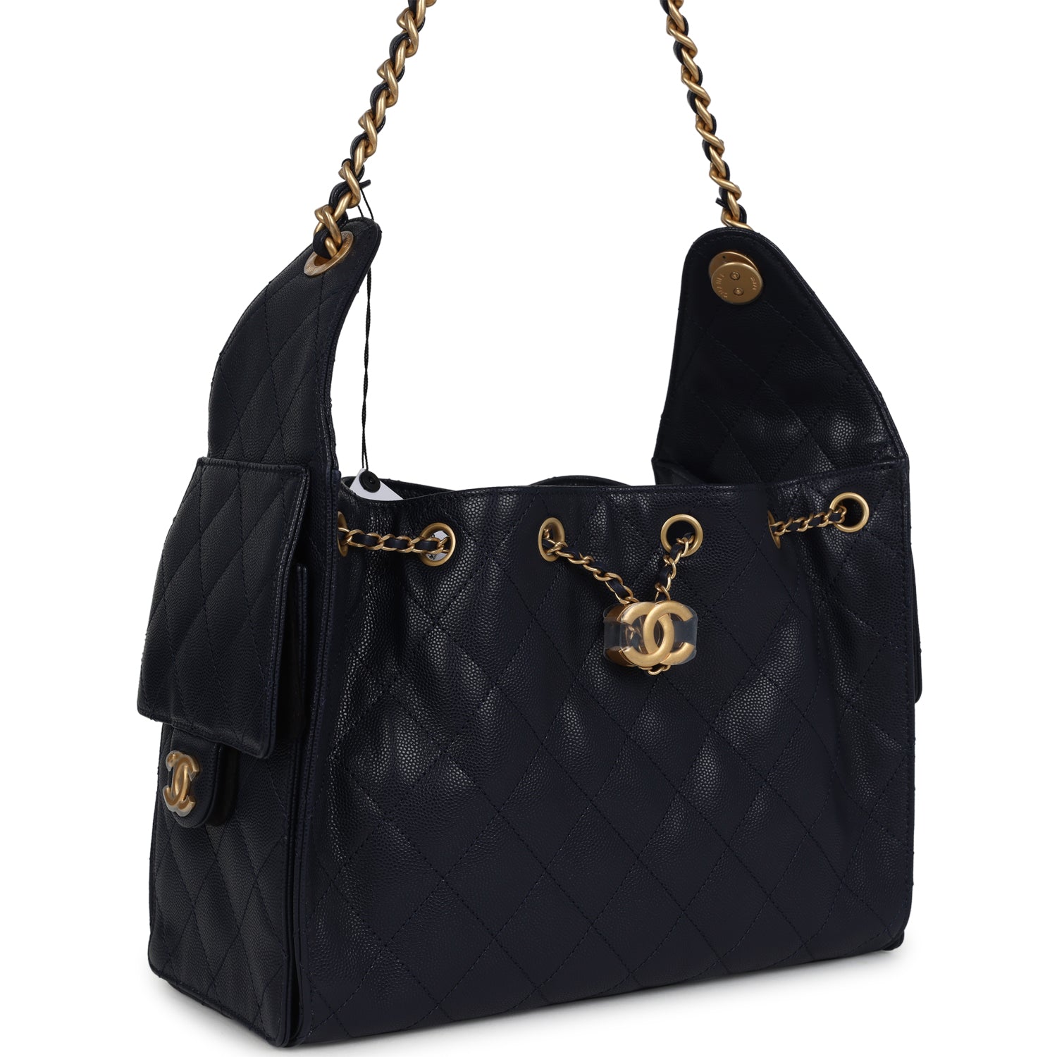 This Chanel Small 25 Hobo Bag is in dark navy caviar leather with antique gold hardware, features signature diamond quilt, two exterior side pockets, drawstring closure, and a single interwoven antique gold and dark navy leather shoulder strap.