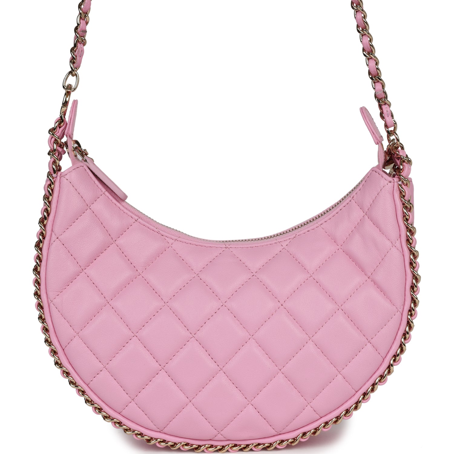 This Small Chain Around Hobo Bag is in Pink Lambskin leather with gold hardware features a gold chain trim around the bag, tonal stitching, zipper closure pull with CC charm, and a single interwoven leather and gold tone chain shoulder/crossbody strap.