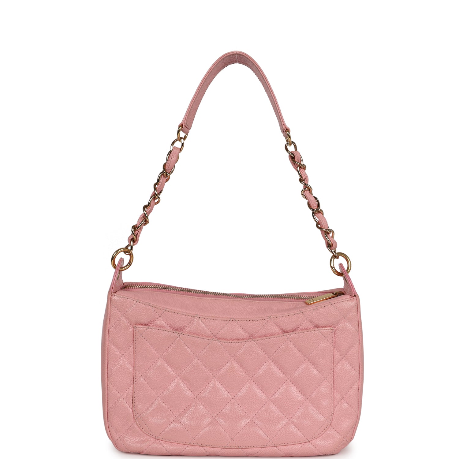 This Timeless Shoulder Bag is in pink caviar with gold hardware, tonal stitching, classic CC logo on front of bag, half moon back pocket on back of bag, strap is comprised of chainlink interwoven with leather and a leather shoulder pad.