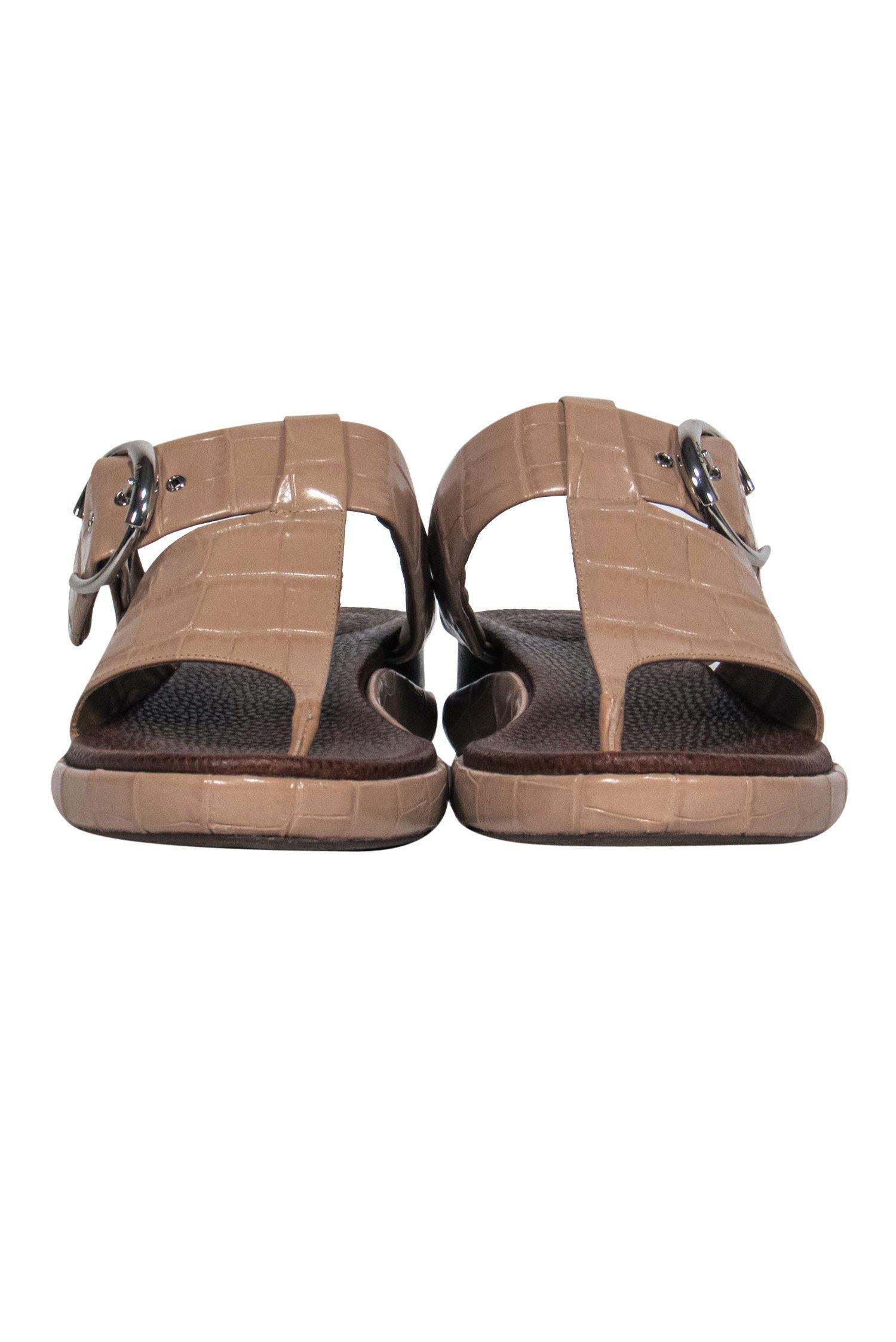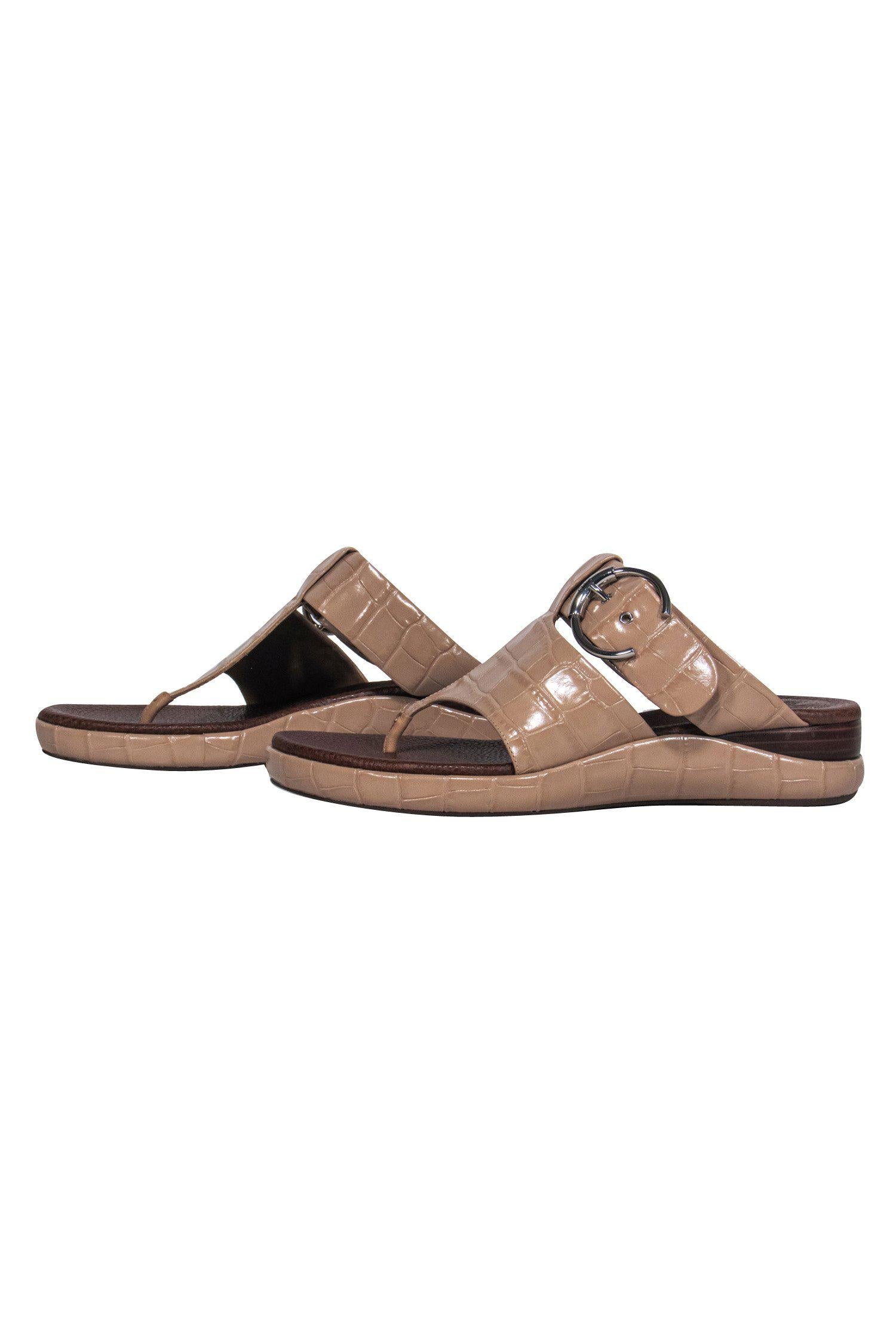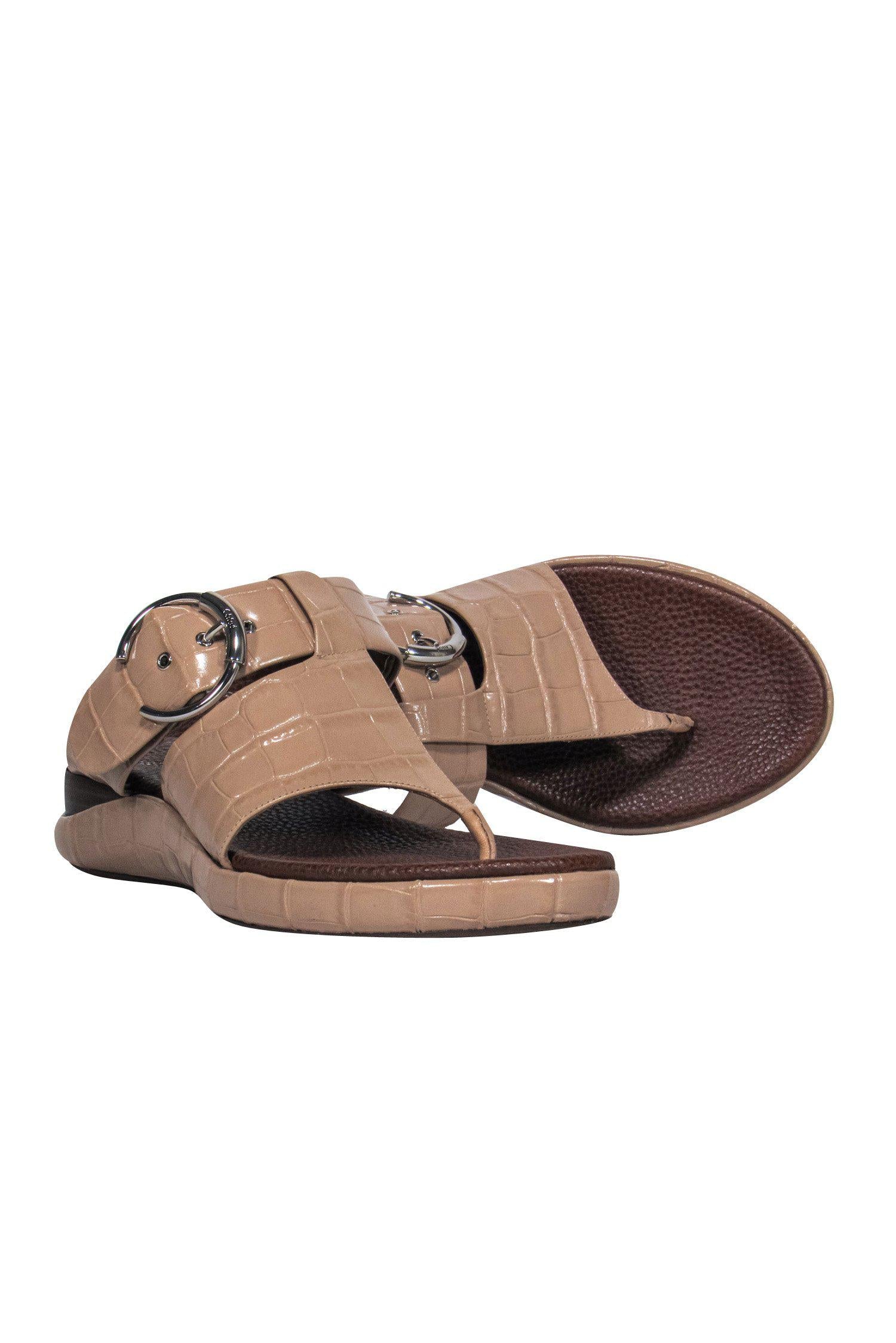 Chloe - Beige Patent Embossed Leather Thong Sandals w/ Buckles Sz 10