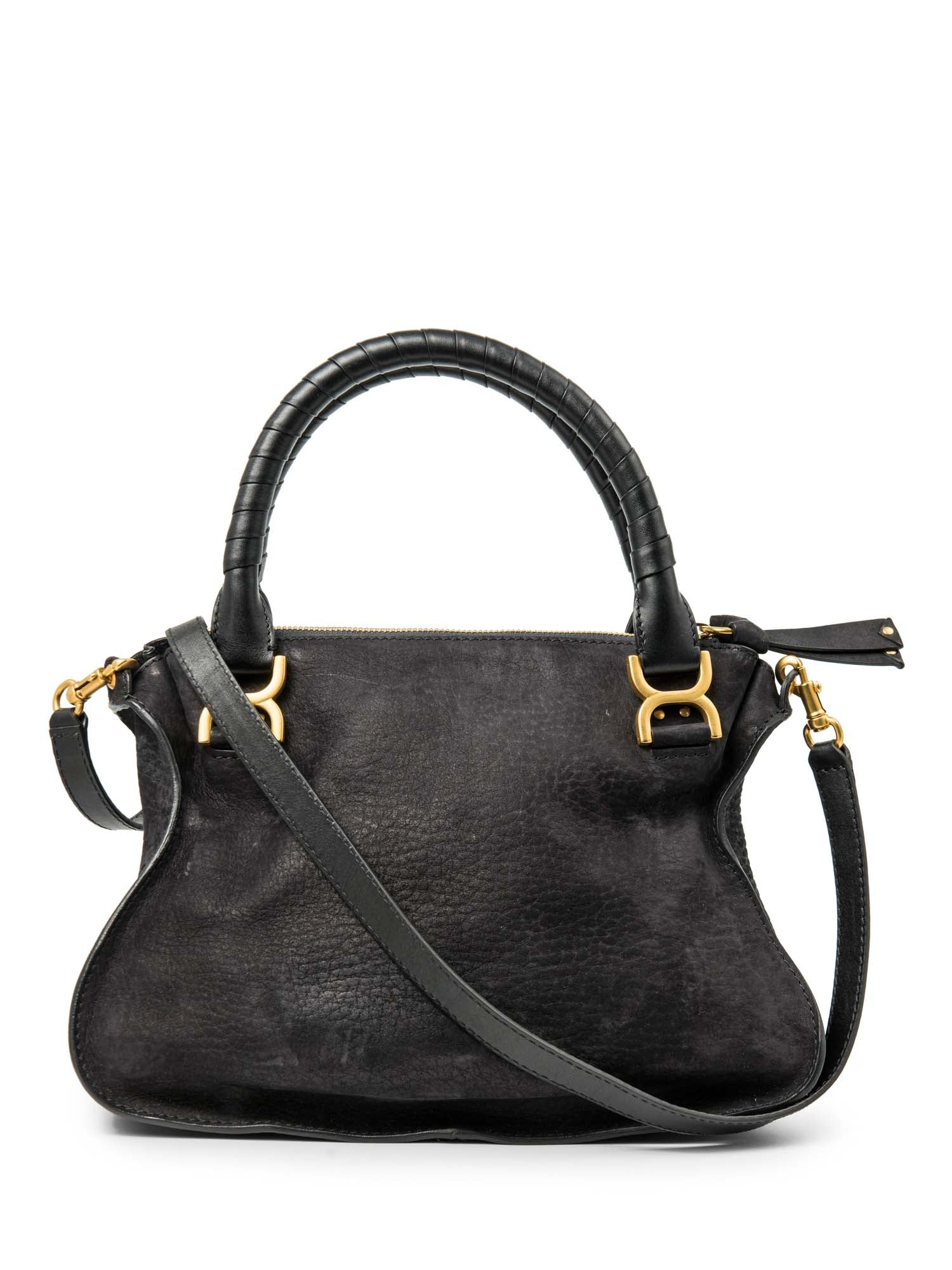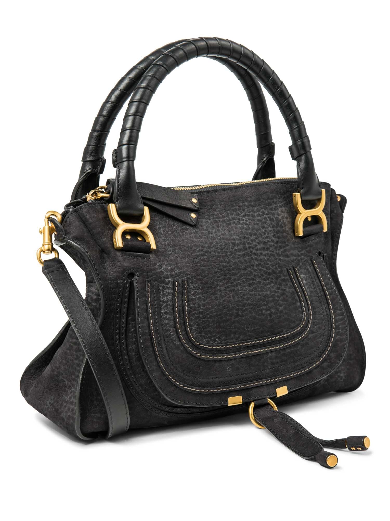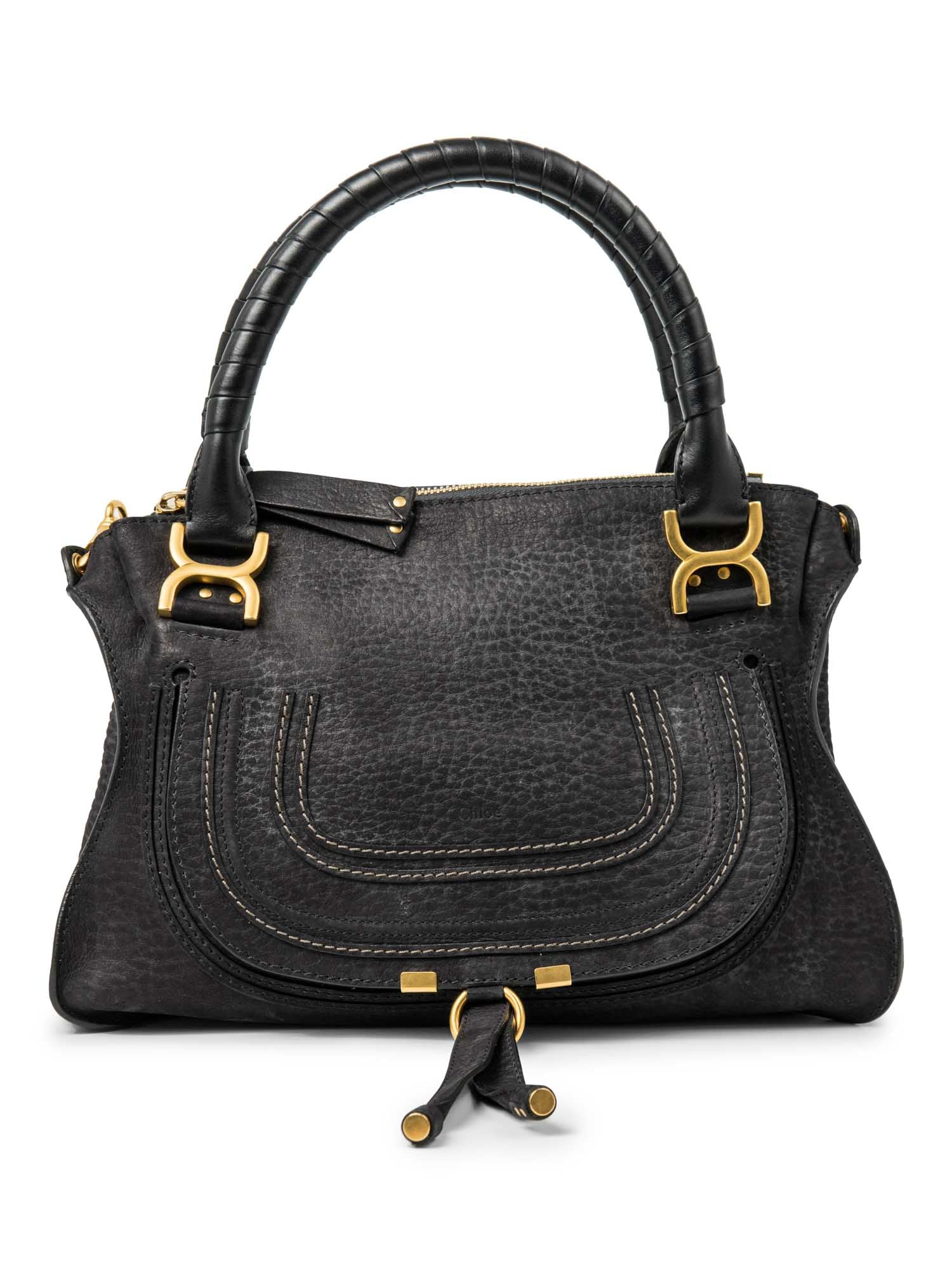 Chloe Marcie Saddle Bag or . This bag is in black color pebble leather. It features bow-shaped handle buckles, gold tone hardware, detachable shoulder strap, top zipper closure and cotton lined interior to compliment the exterior.