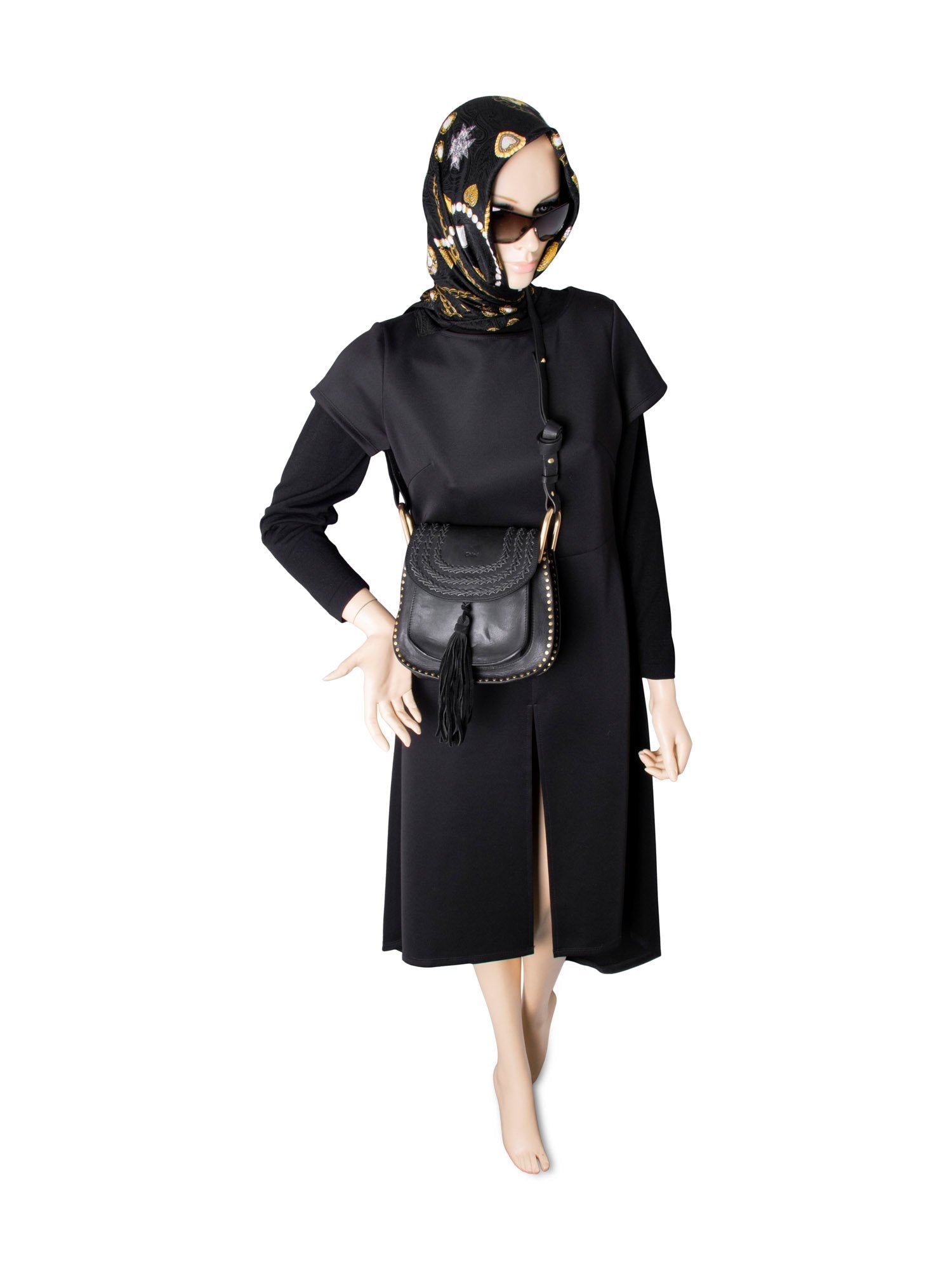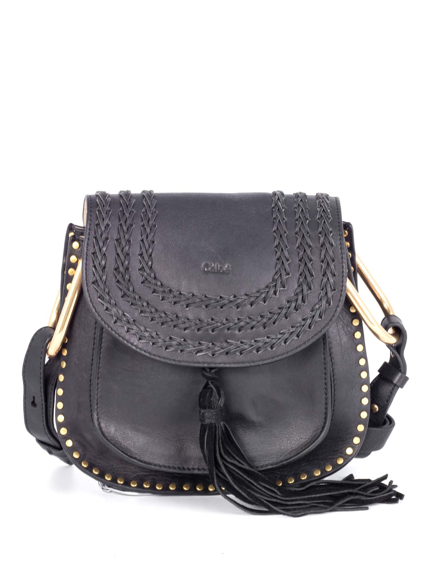 Chloe Leather Hudson Cross Body Bag or . This stylish bag is crafted in black leather, featuring a long crossbody shoulder strap and polished gold tone studs and hardware along the outer borders. The flap has leather braided detailing and a suede leather tassel and opens to a beige suede interior with a pocket.