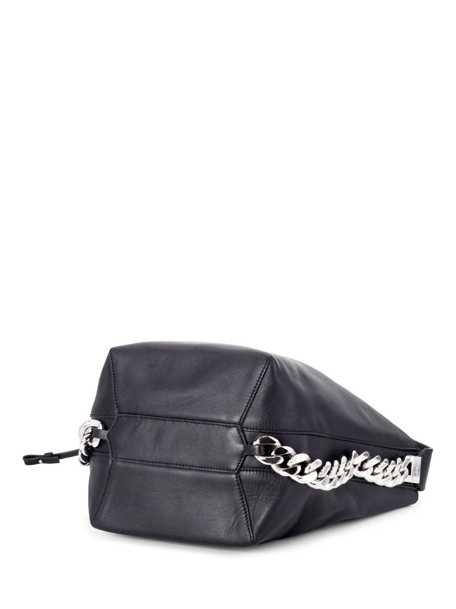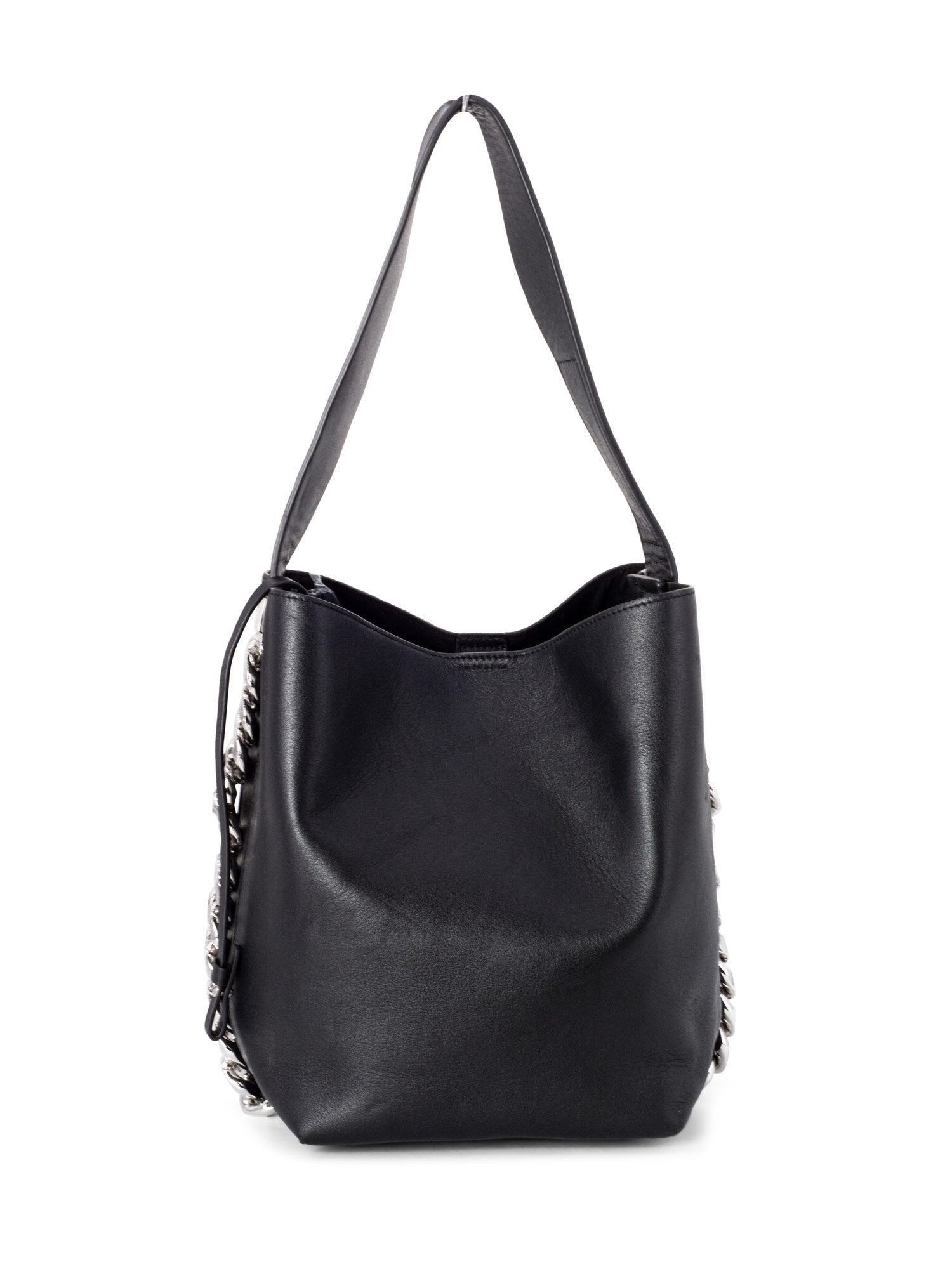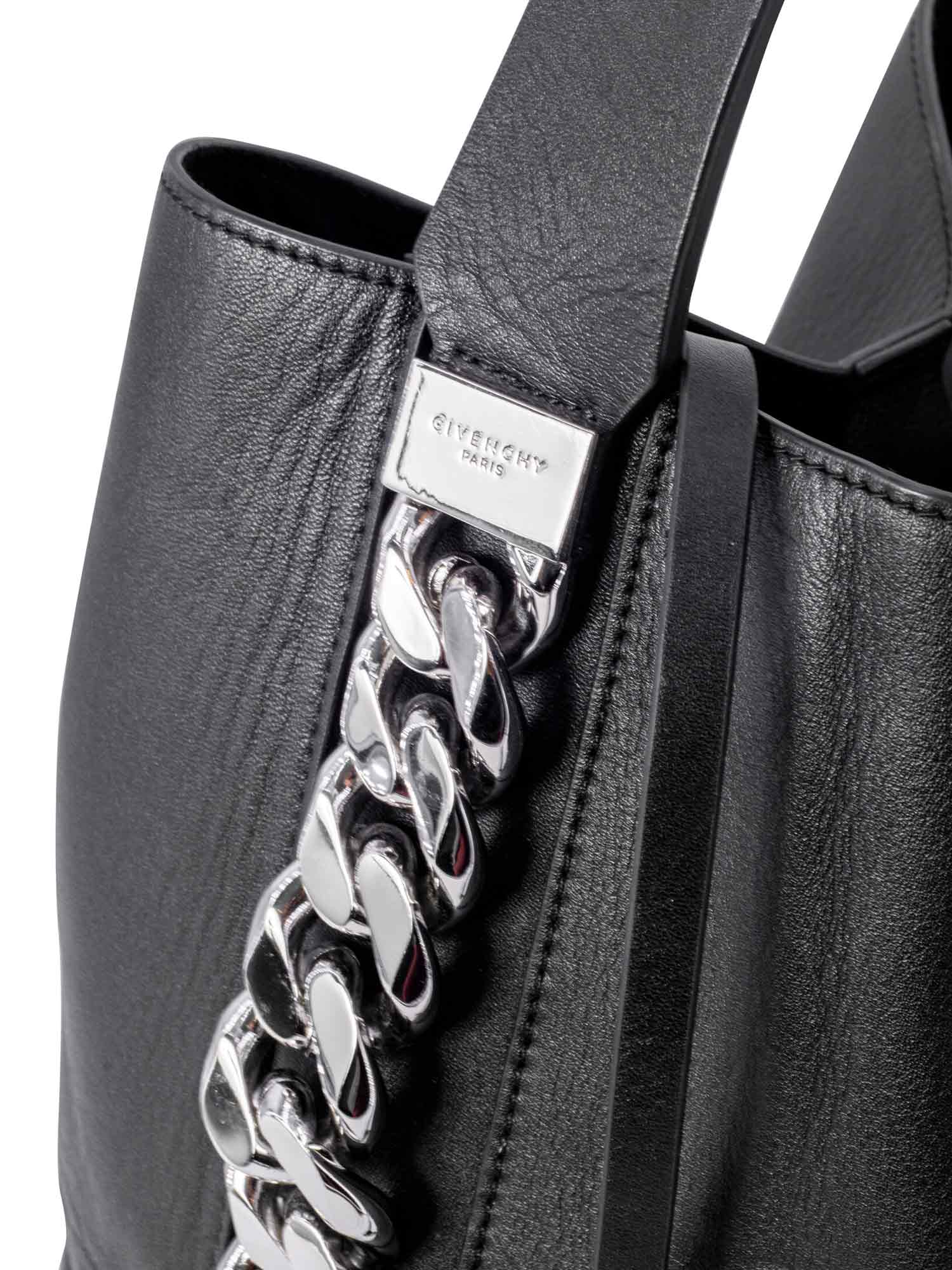 Givenchy Infinity Chain Bucket Bag or . This bag is in black leather and silver hardware, with a thick shoulder strap, featuring an oversized chain detailing around the sides of the bag and a magnetic snap button closure.