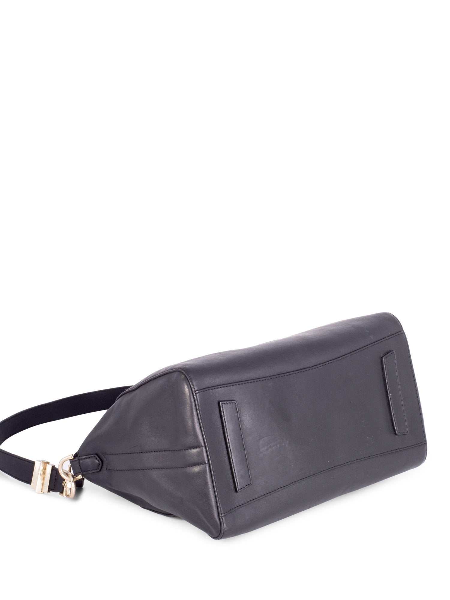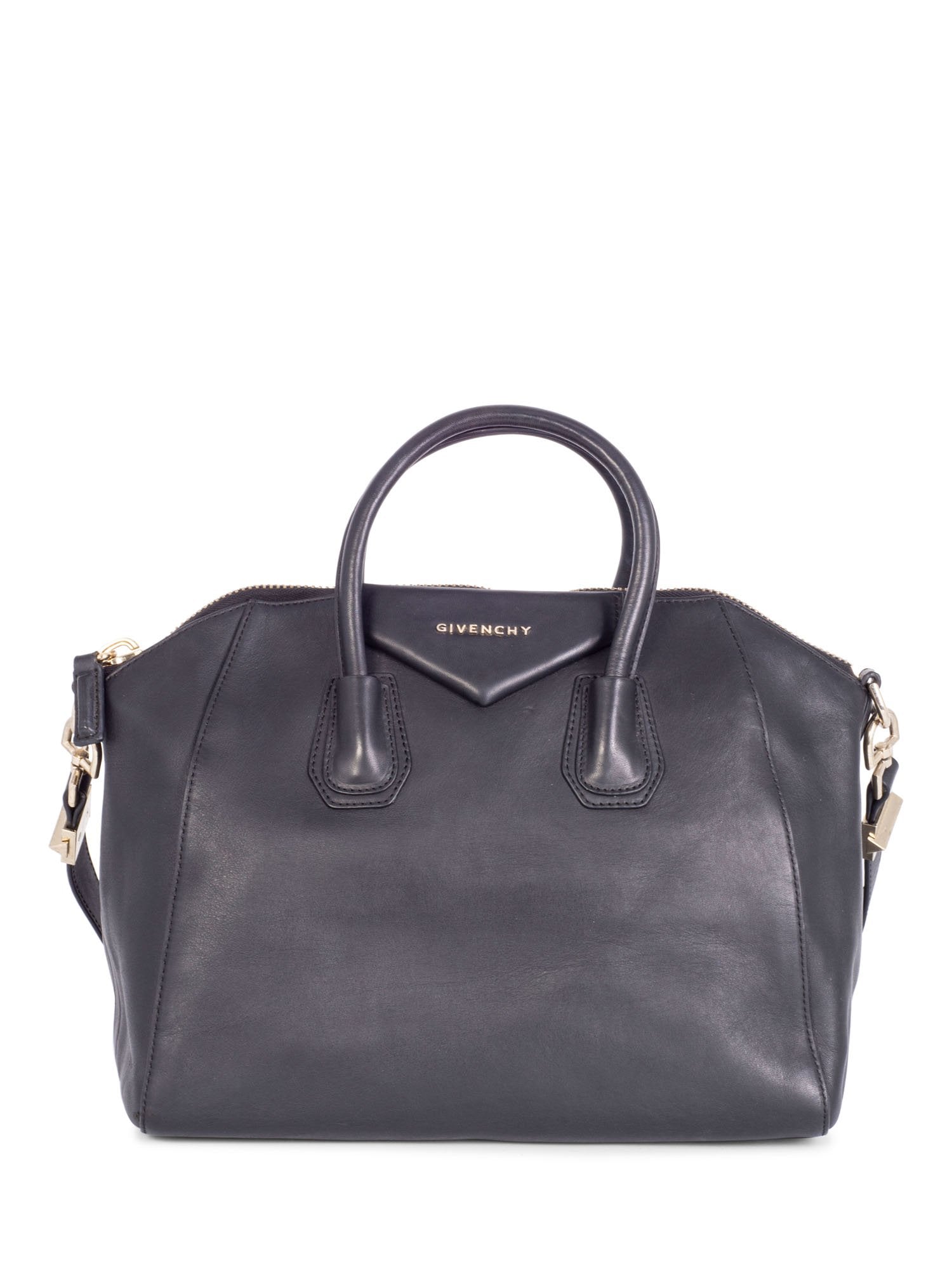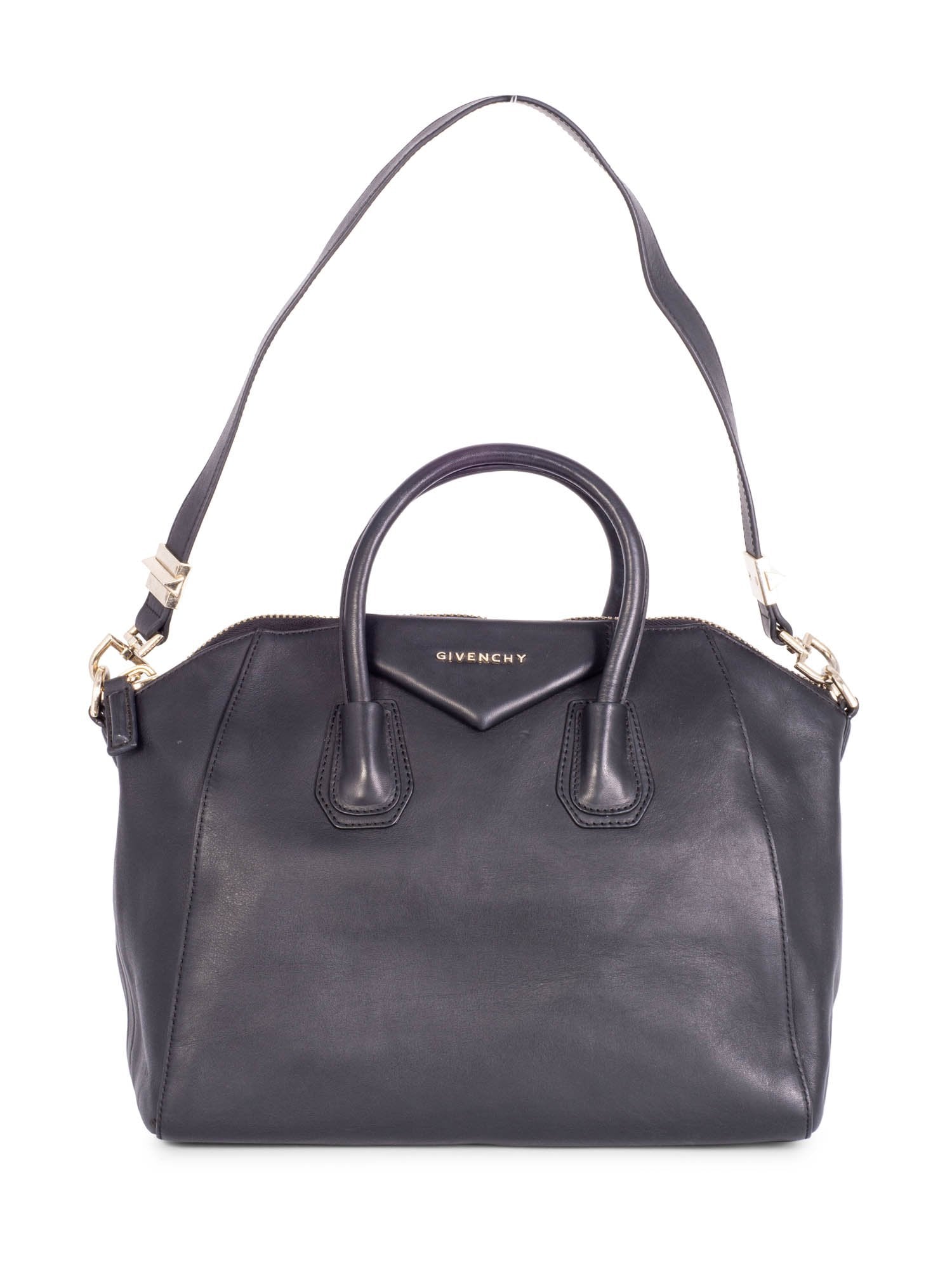 Givenchy Medium Antigona Bag or . This elegant bag is crafted of luxurious smooth calfskin leather in black. The bag features sturdy rolled leather top handles, a leather shoulder strap and gold-tone hardware. The top zipper opens to a spacious fabric interior with a zipper pocket and patch pockets.