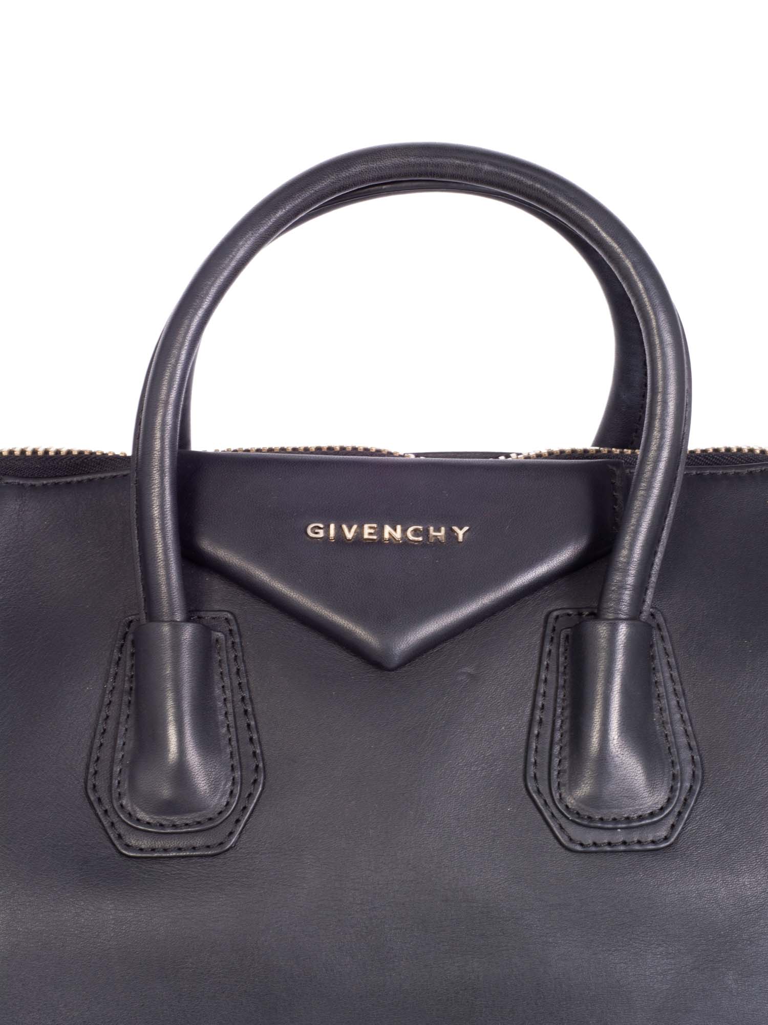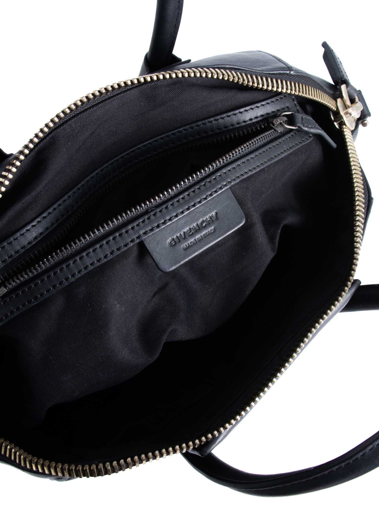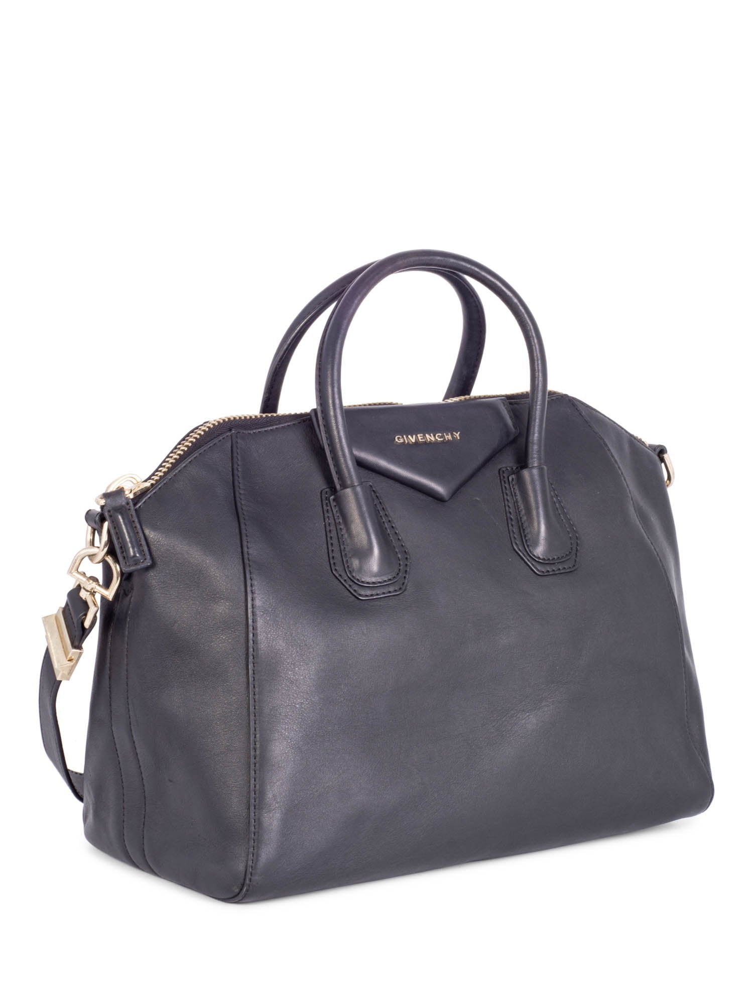 Givenchy Medium Antigona Bag or . This elegant bag is crafted of luxurious smooth calfskin leather in black. The bag features sturdy rolled leather top handles, a leather shoulder strap and gold-tone hardware. The top zipper opens to a spacious fabric interior with a zipper pocket and patch pockets.