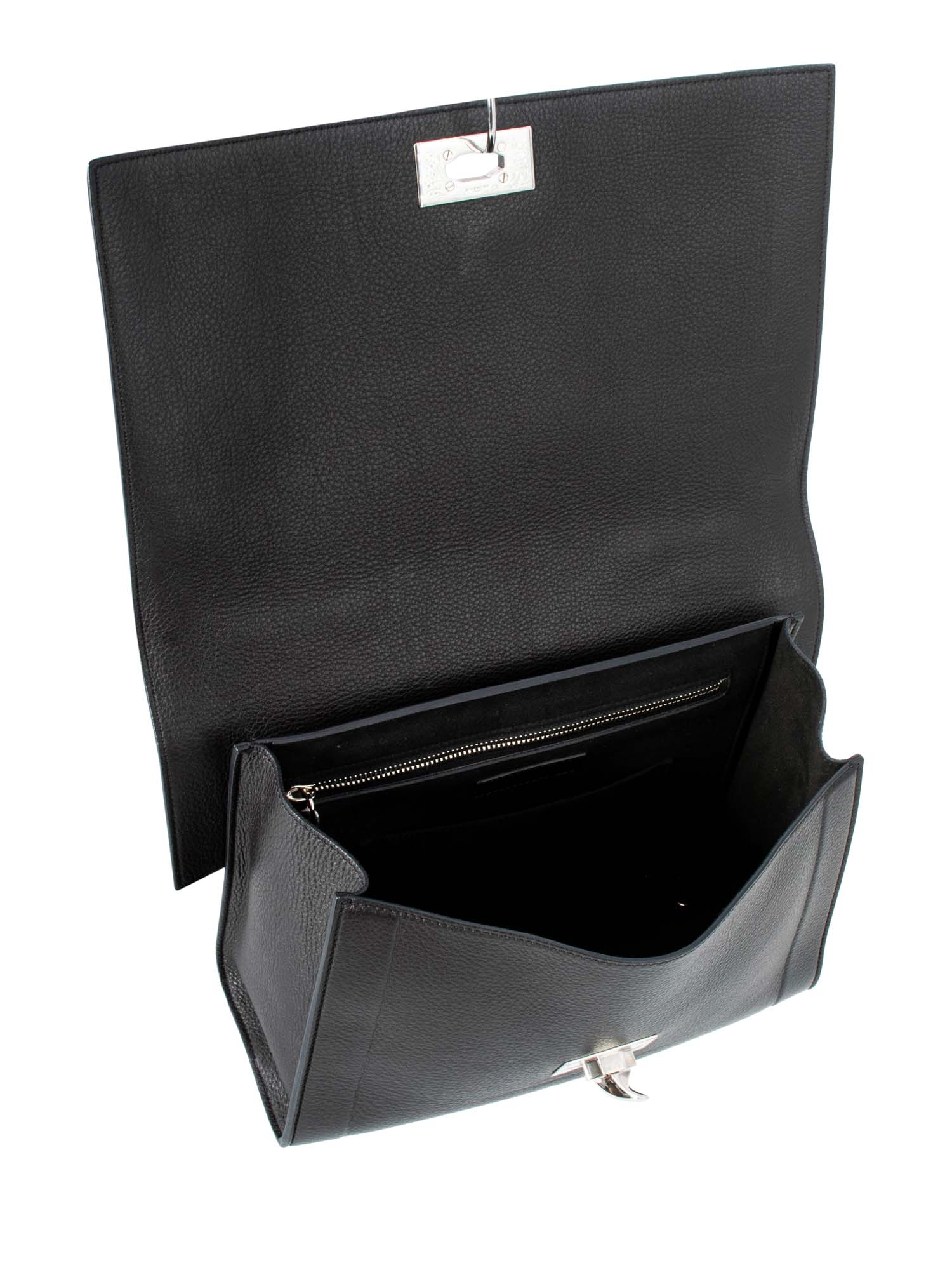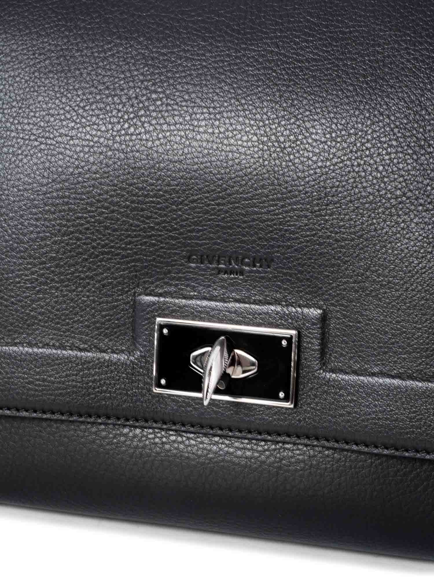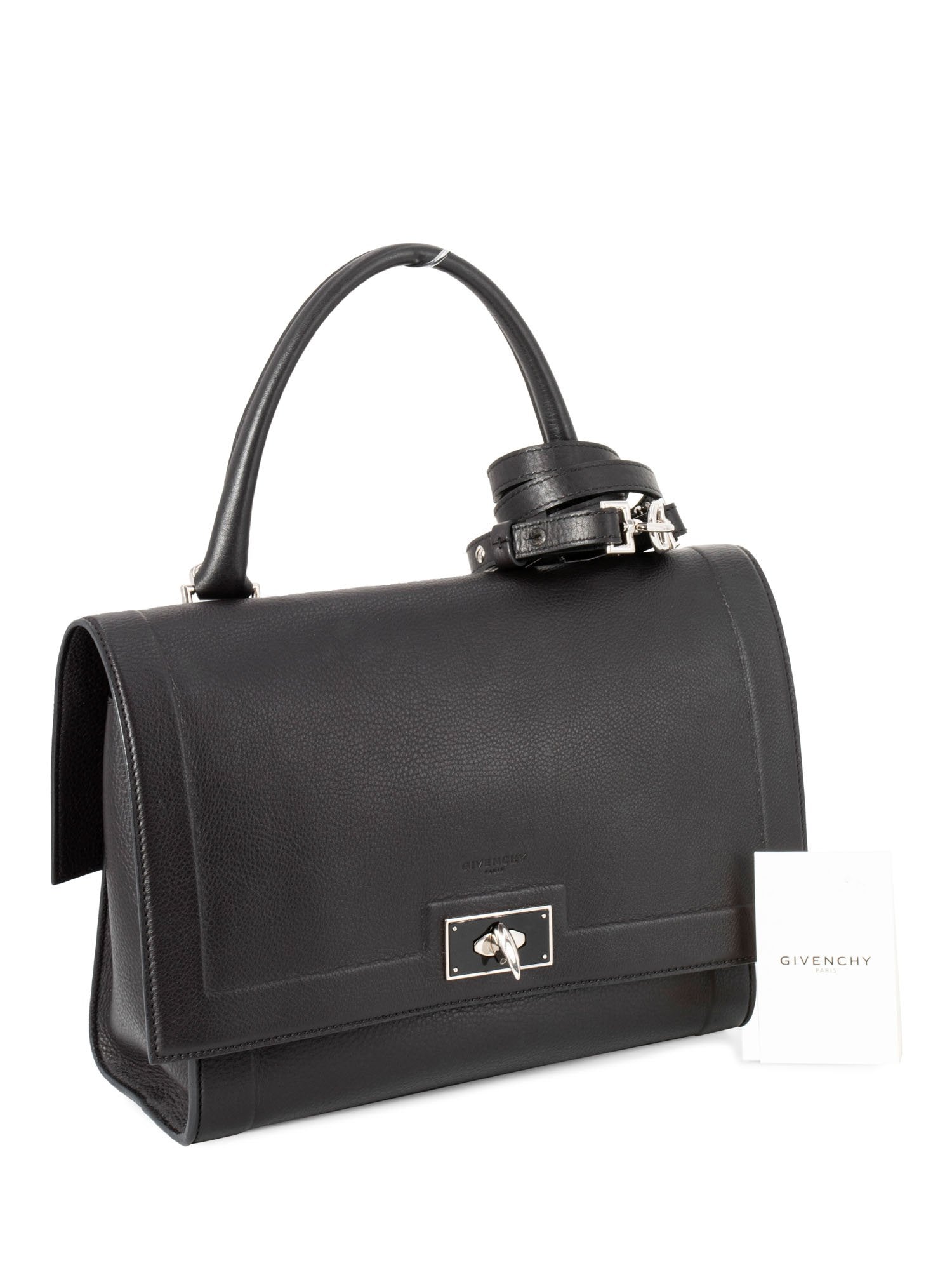 Givenchy Shark Satchel Bag or . This bag is in black calfskin leather with silver toned-hardware. It features rolled top leather handle with shark tooth shaped turn lock closure and removable crossbody strap. The interior is in smooth black suede with one zipper pocket.