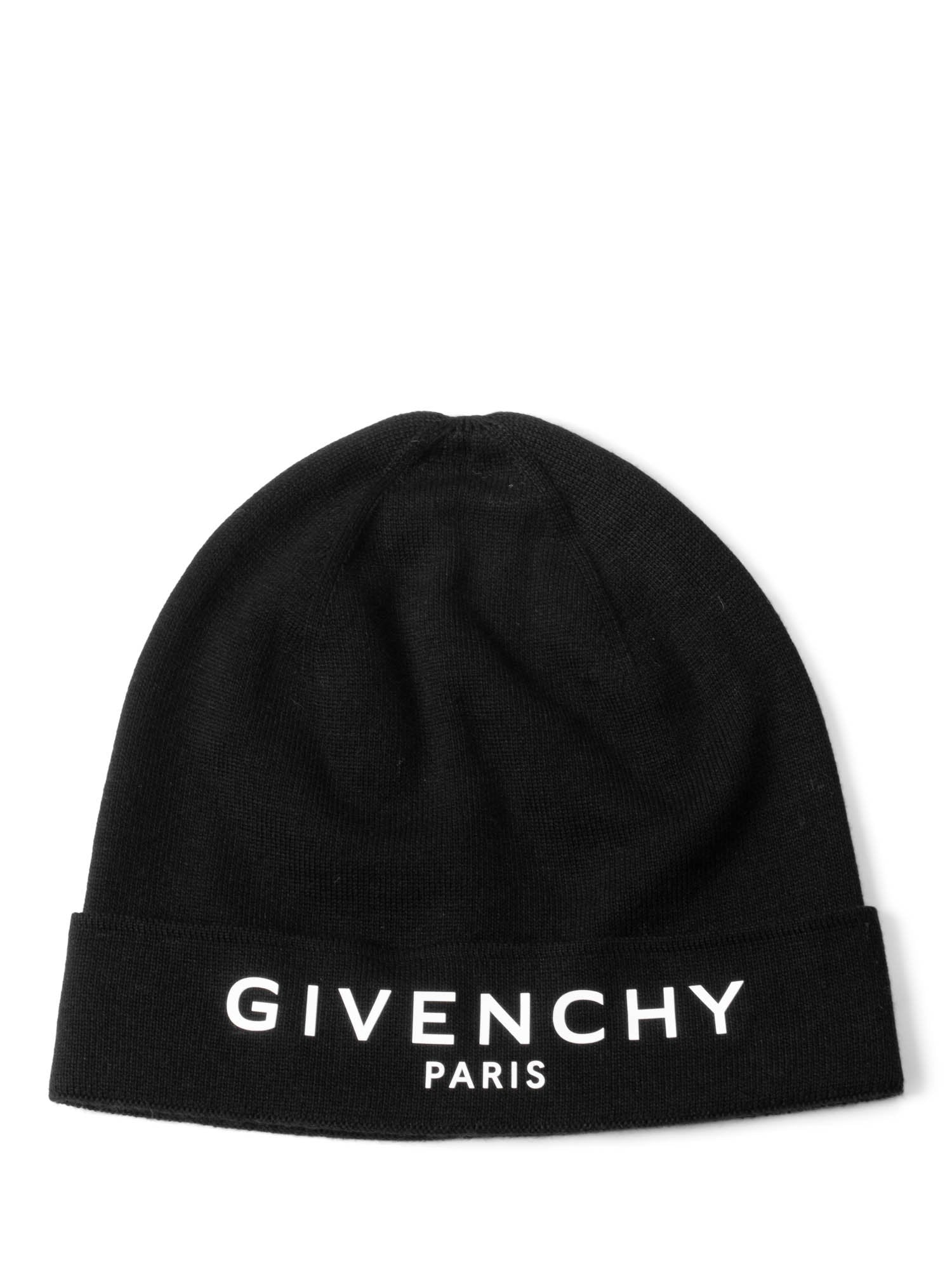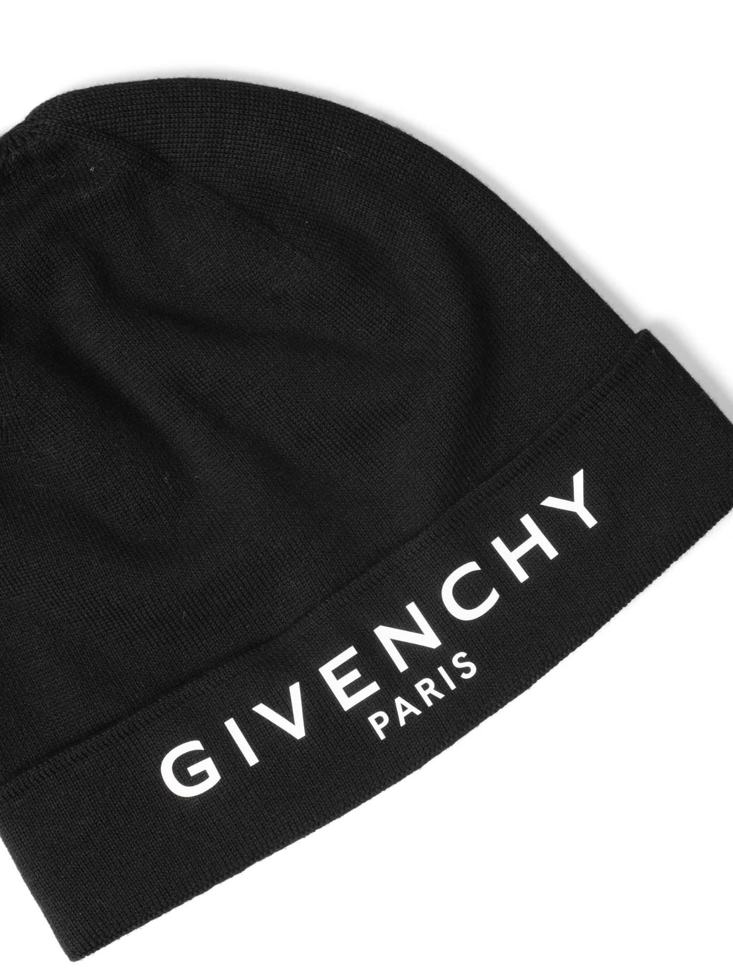Givenchy Logo Knit Beanie Hat or . This knitted beanie hat comes in black cotton and cashmere fabric blend. The embroidered moniker is featured on the fold over cuff of the beanie.