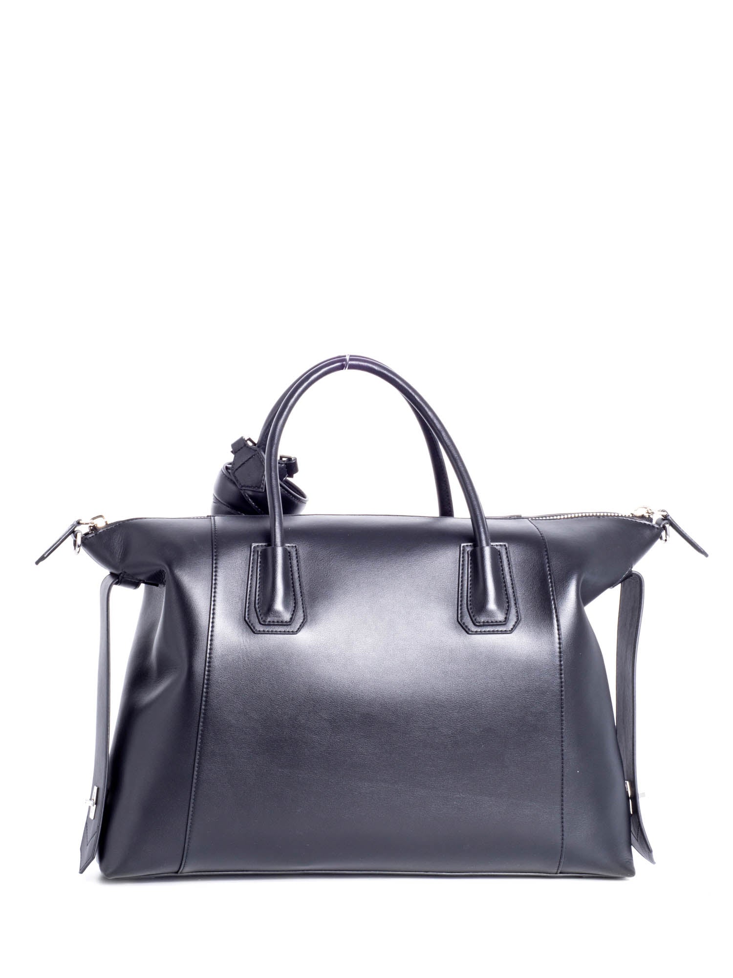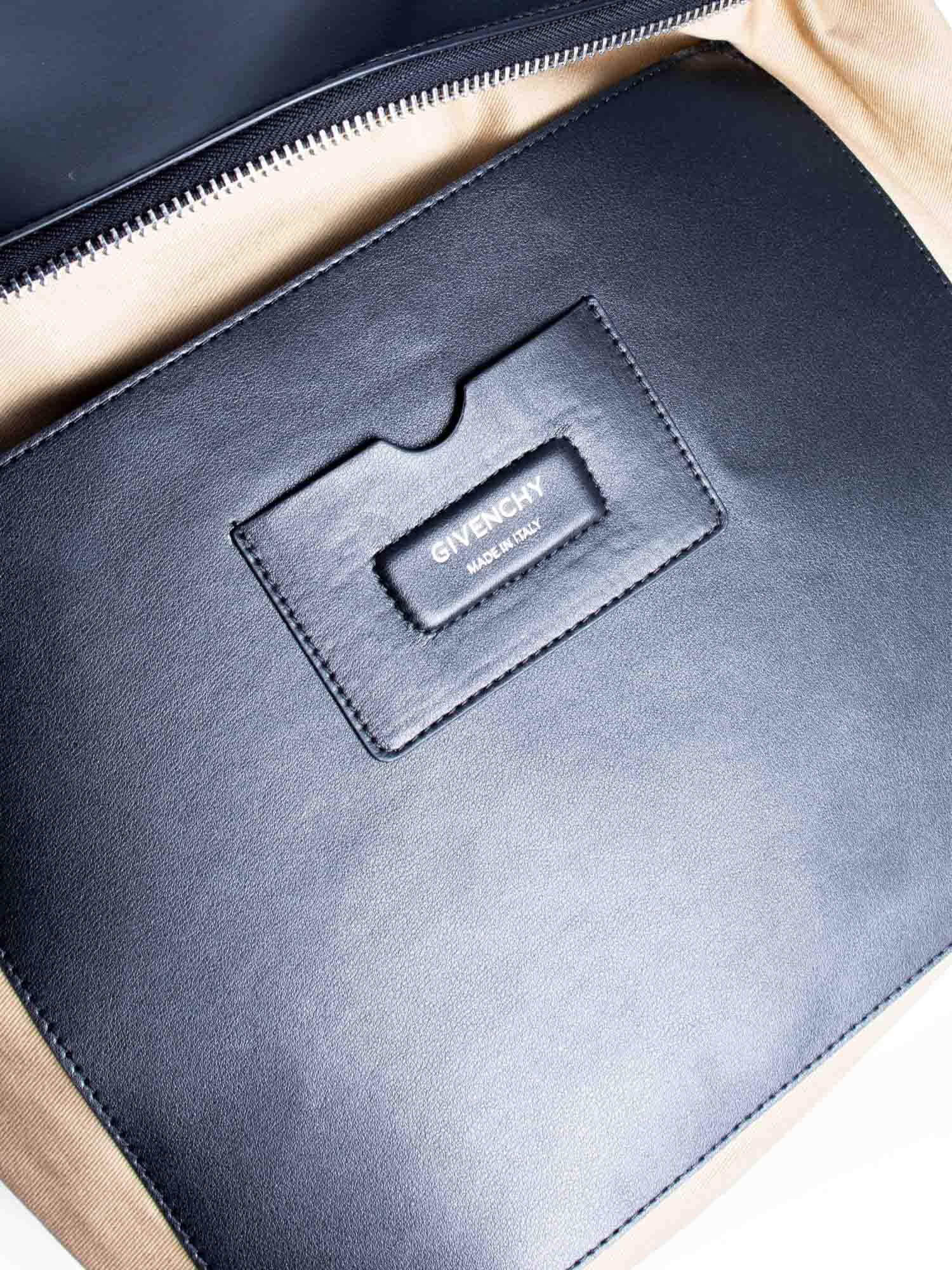 Givenchy Large Antigona Bag or . This bag is crafted of luxurious soft calfskin leather in black. The bag features sturdy rolled leather top handles, a leather shoulder strap and silver-tone hardware. The top zipper opens to a spacious fabric interior with one large patch pocket.
