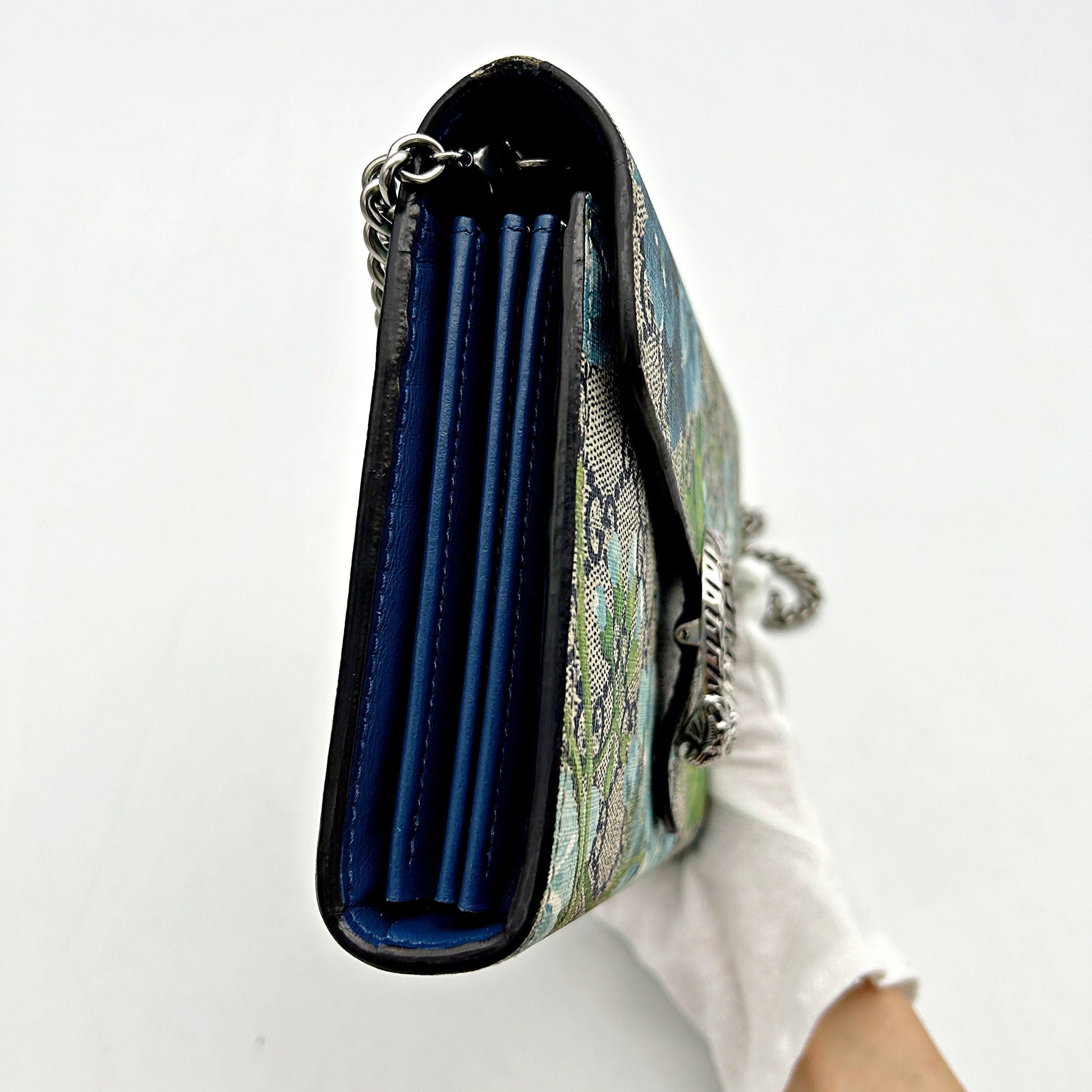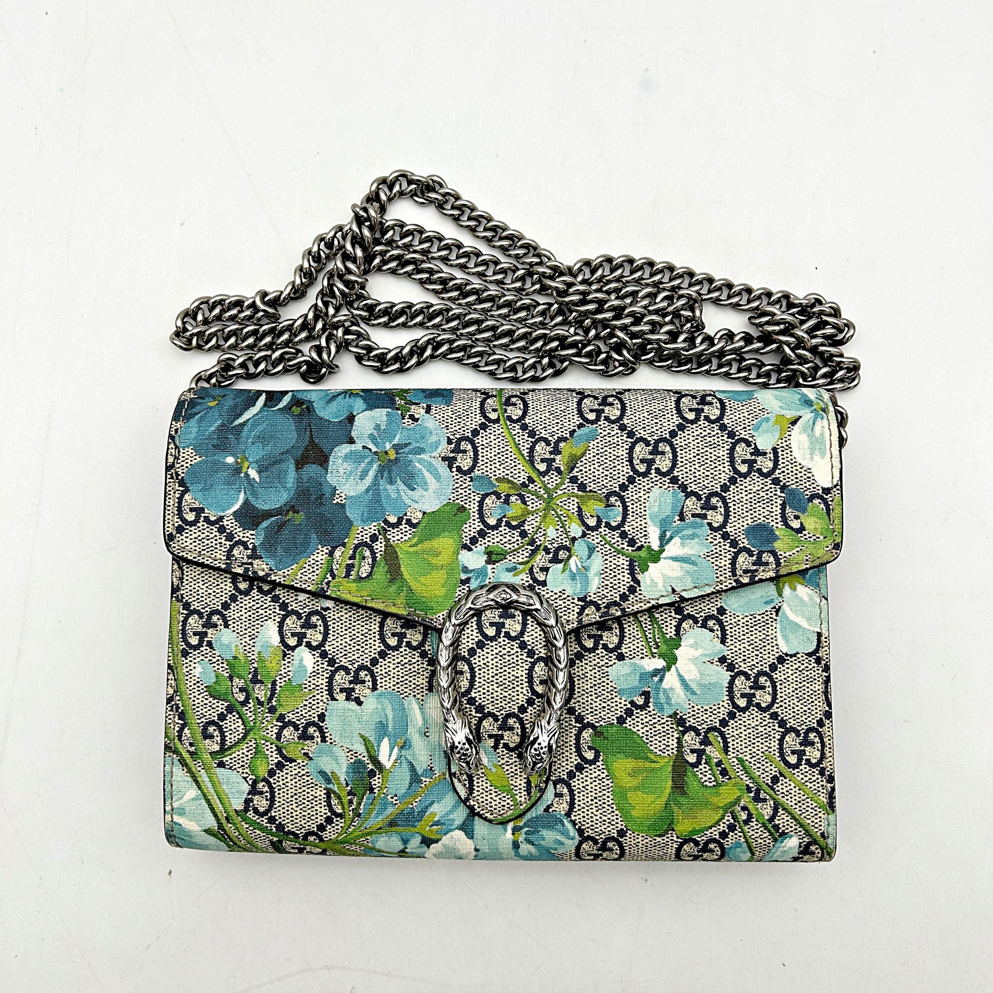 Presenting the GUCCI GG Supreme Monogram Blooms Mini Dionysus Chain Wallet in Beige Blue Navy Vintage Blue, a sophisticated accessory for women. Crafted from GG Supreme Monogram coated canvas, this elegant wallet features the iconic Blooms pattern and a distinctive Dionysus clasp closure. Measuring 4.3 x 7.5 x 1.5 inches, it offers a compact yet functional design with a silver-tone chain strap. This piece is in great condition (8.5/10), with exterior well-preserved and interior showing light wear. Comes with original dust bag and , making it a timeless addition to your collection. |