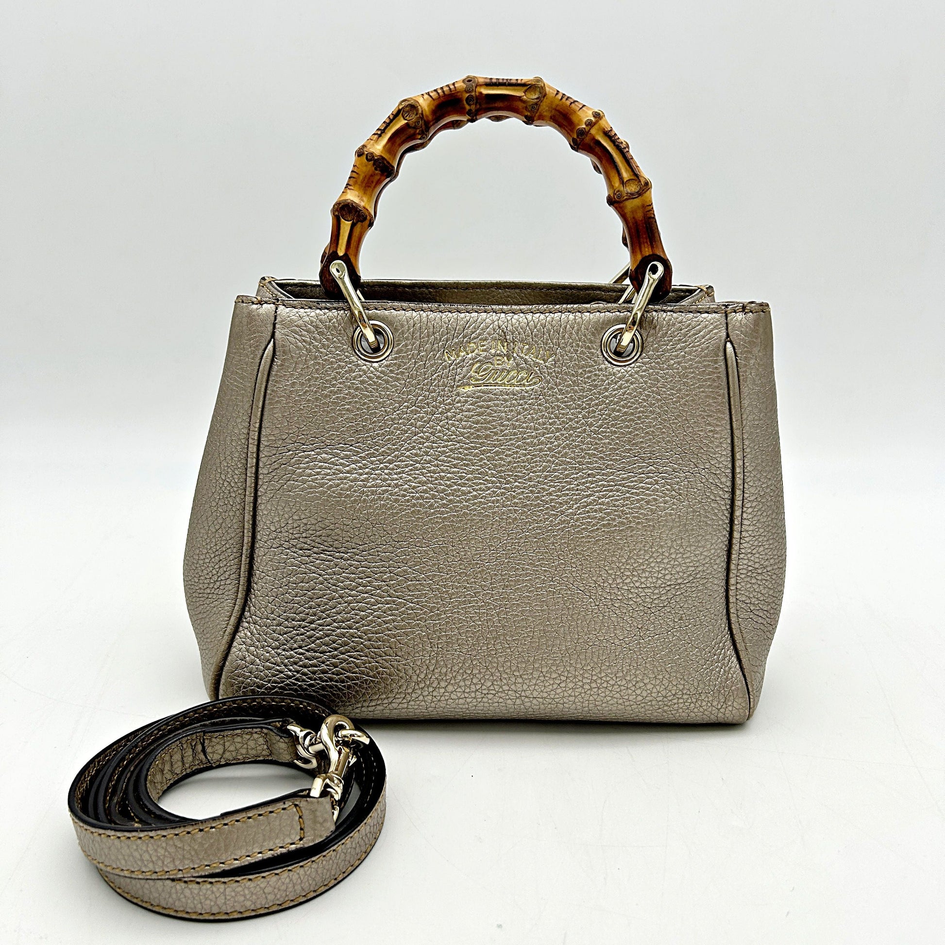 Presenting the Gucci Metallic Gold Leather Mini Bamboo Tote, a refined accessory that perfectly blends luxury and functionality. Crafted from premium metallic gold leather with natural bamboo handles and a matching leather strap, this mini bag measures a compact 7.1 x 1.97 x 7.09 inches, ideal for elegant daily use. The beige canvas lining enhances its sophisticated appeal. This piece is and comes with the original dust bag. Rated 8.5/10, it shows minor wear on exterior corners and light interior use, maintaining excellent overall condition. A timeless addition to any discerning woman's collection. |